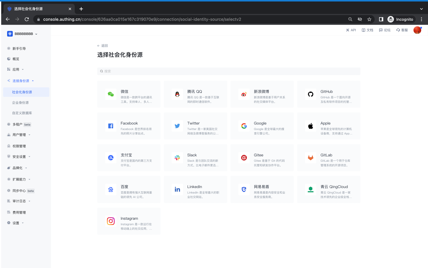 有关支持「社会化身份源」功能权益的 Authing 用户池版本信息,请查看 官网「价格」页 (opens new window)。如你的版本不支持此权益,且想试用,可开通体验期。有关体验期介绍及开通方式,请查看 体验期。