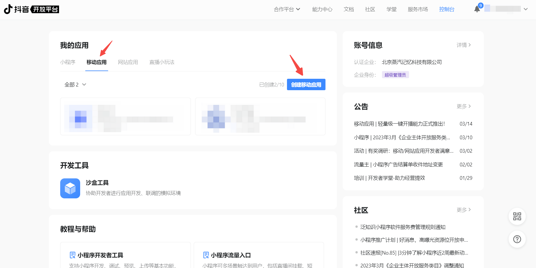 点击页面左上方的 控制台 完成注册并发起审核,然后依次点击「移动应用」和「创建应用」来创建一个使用抖音登录的移动应用。过程中如遇到任何问题,请参考页面上方的抖音官方「文档资料」。