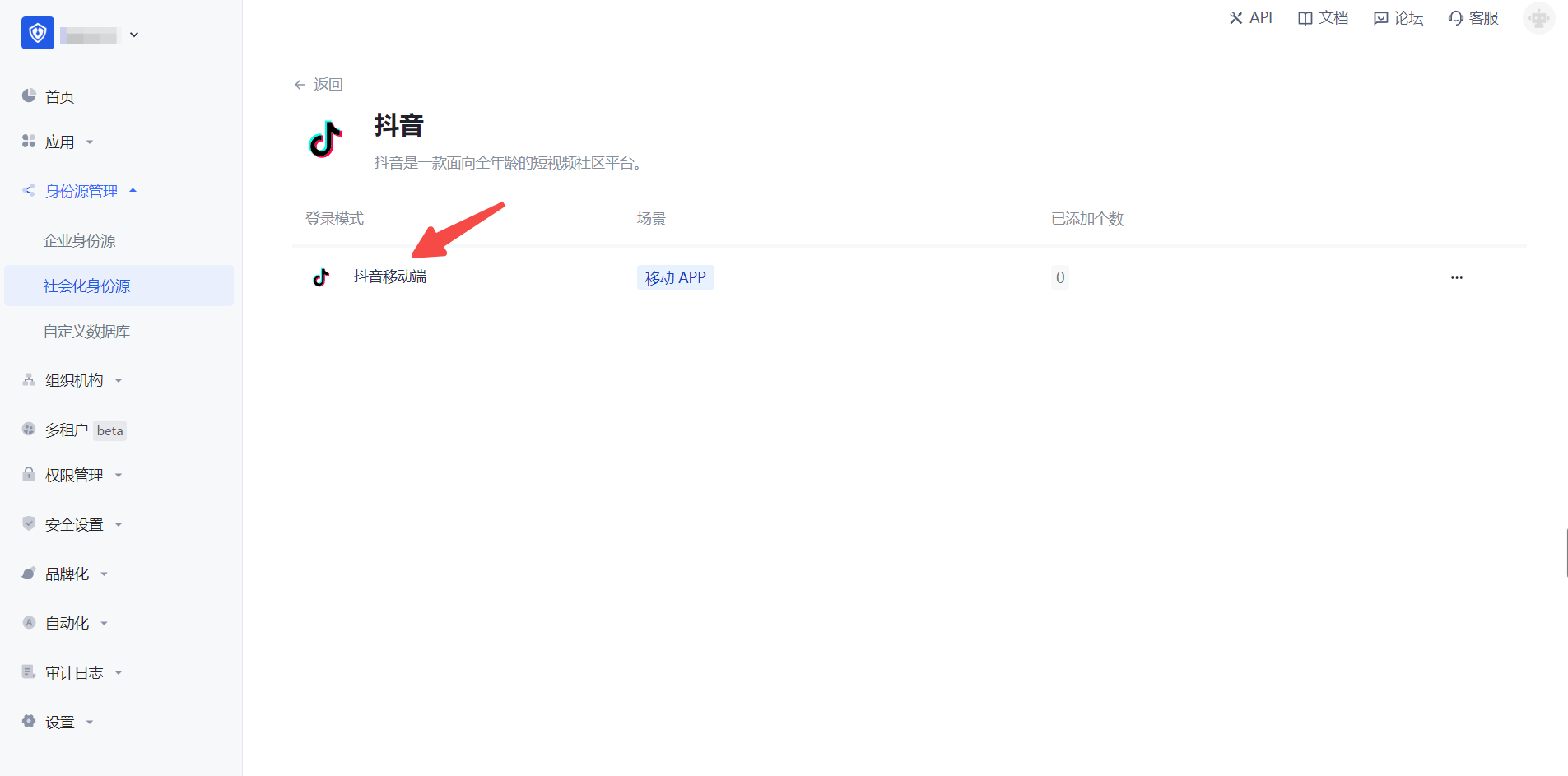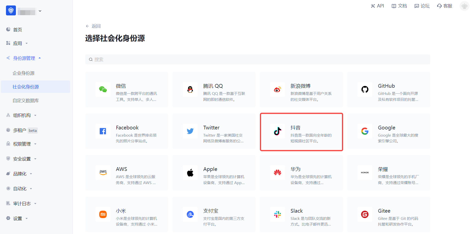 2.2 请在 Authing 控制台 的「社会化身份源」-「选择社会化身份源」页面,点击「抖音」身份源按钮,进入「抖音移动端登录模式」页面。