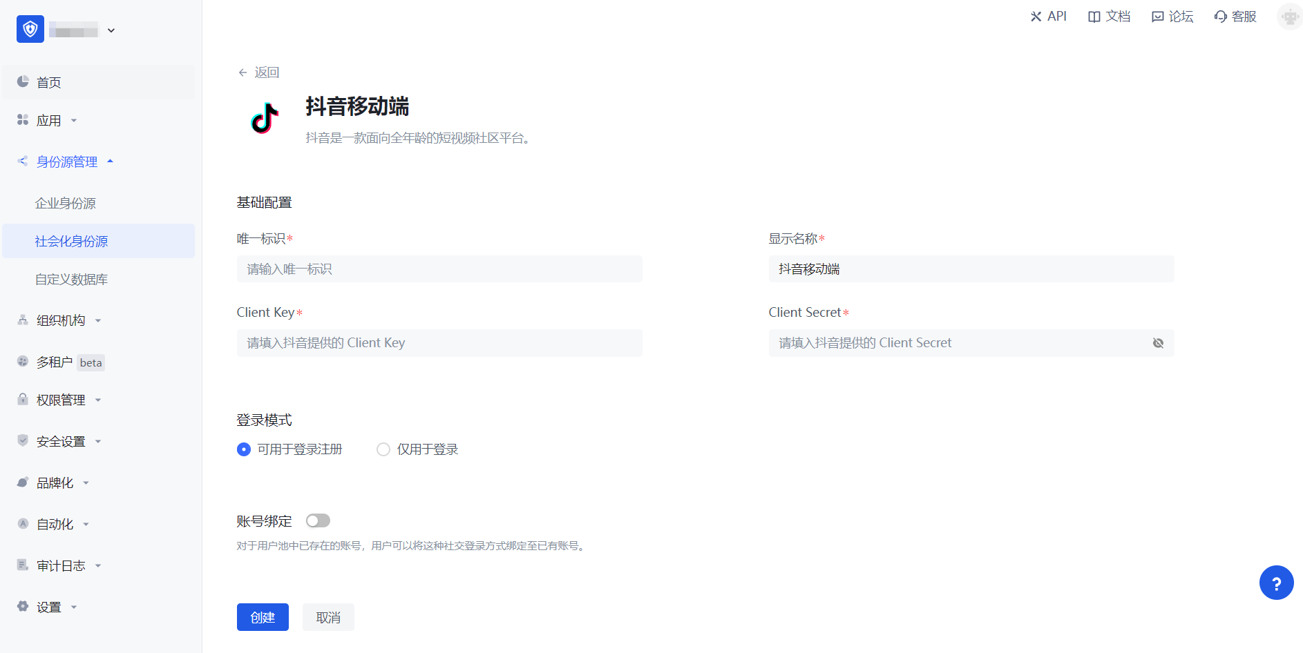 2.3 请在 Authing 控制台 的「社会化身份源」-「抖音移动端」页面,配置相关的字段信息。
