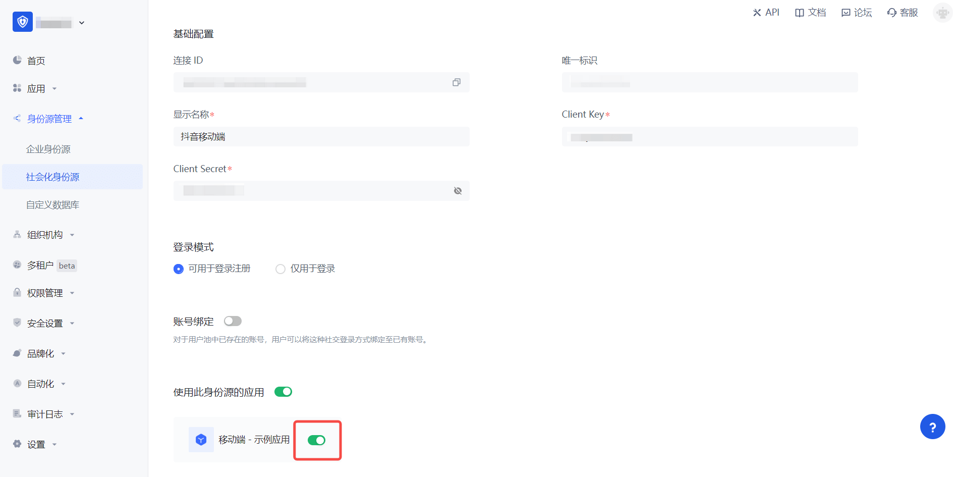 3.2 在已创建好的「抖音移动端」身份源连接详情页面,开启并关联一个在 Authing 控制台创建的应用
