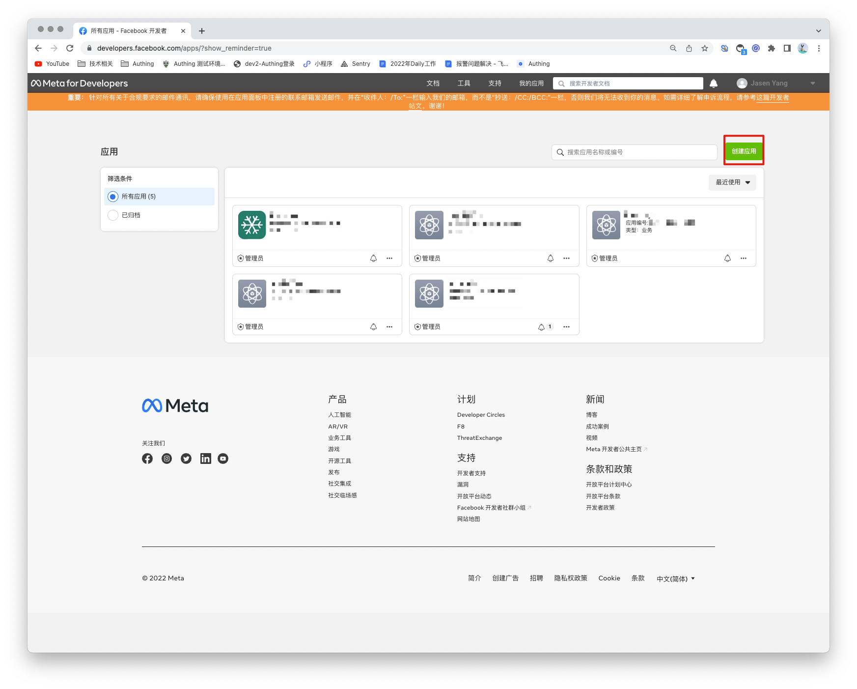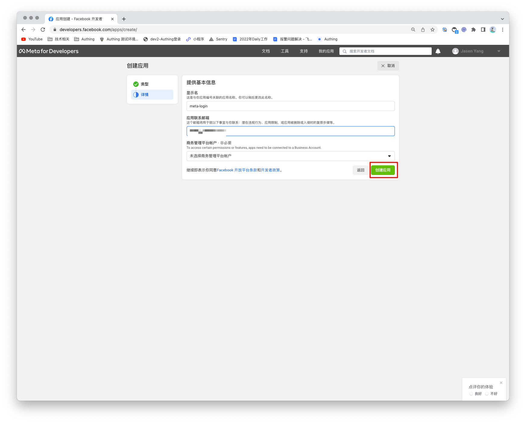 前往 developers.facebook.com (opens new window),点击我的应用,然后创建新应用并选择消费者或无应用类型,填写应用名称。