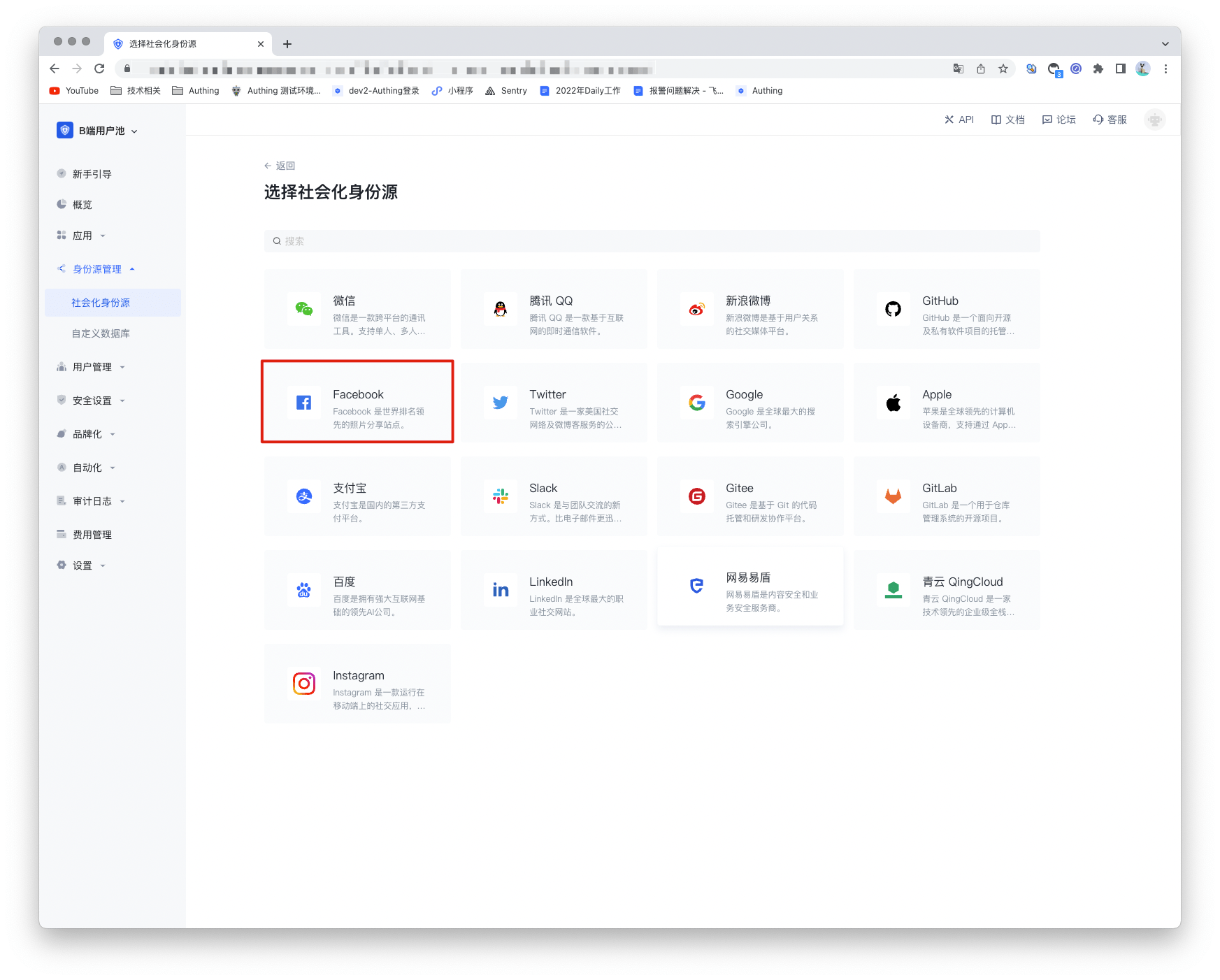 2.2 请在 Authing 控制台 的「社会化身份源」-「选择社会化身份源」页面,点击「Facebook」身份源按钮,进入 「Facebook 登录模式」页面。