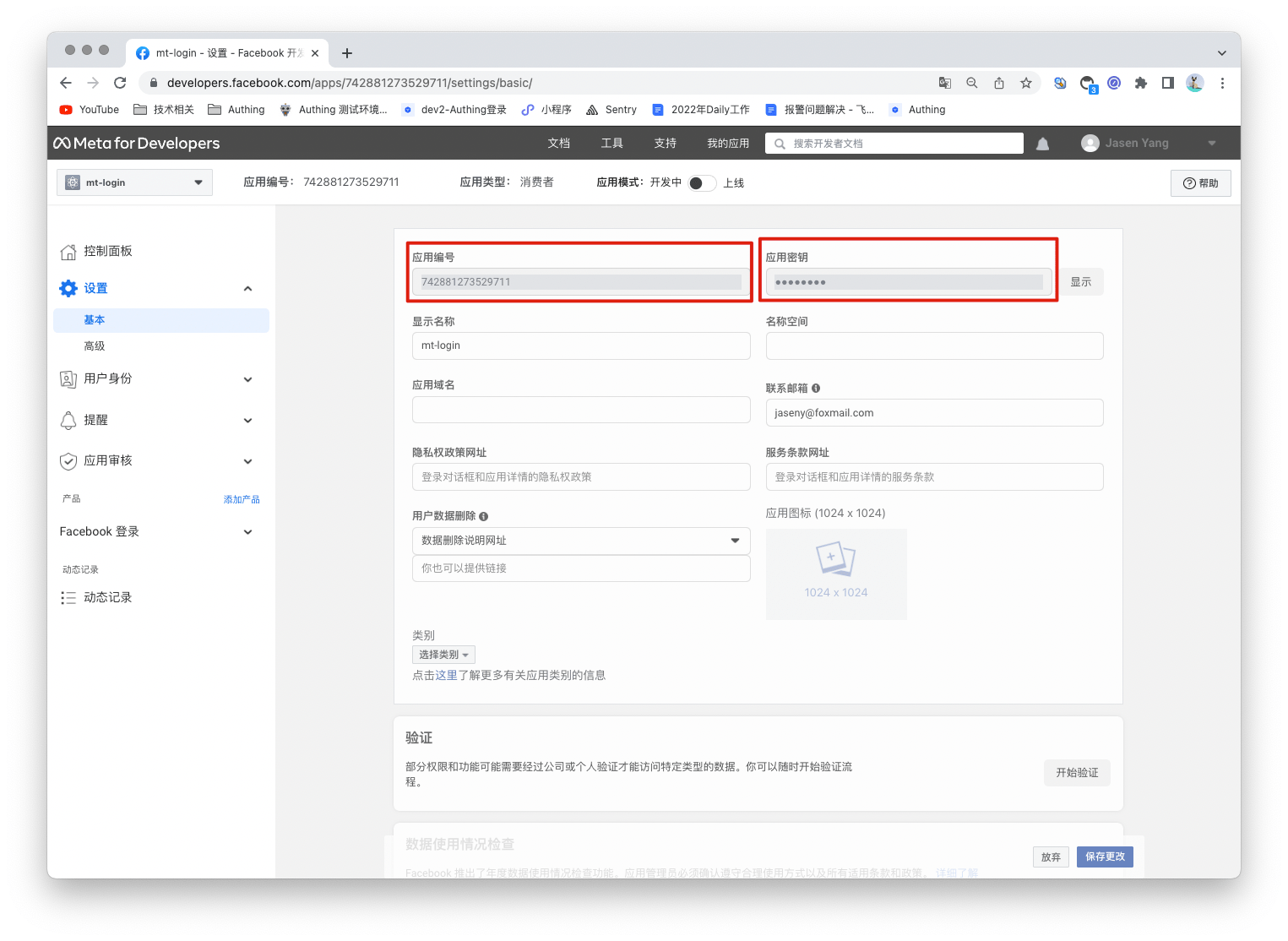 在控制面板中,找到 Facebook 登录 产品,然后点击设置,将其添加至你的应用。之后在左侧的菜单中设置>基本中找到该应用编号和应用密钥,并记录下。
