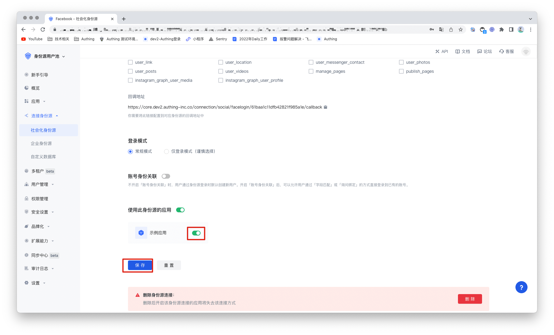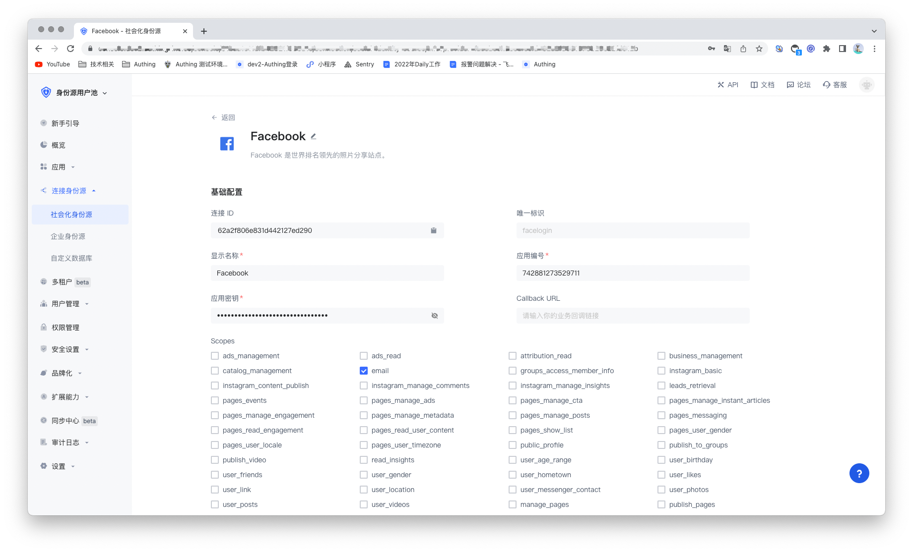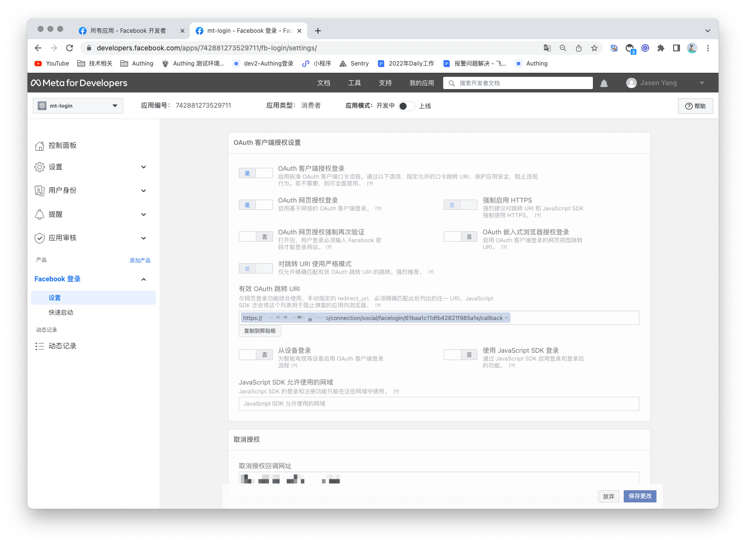 在 Authing 控制台上创建完 Facebook 身份源后,需要将回调地址配置到 Facebook 的开放平台上的 Facebook 应用中OAuth 客户端授权设置。
