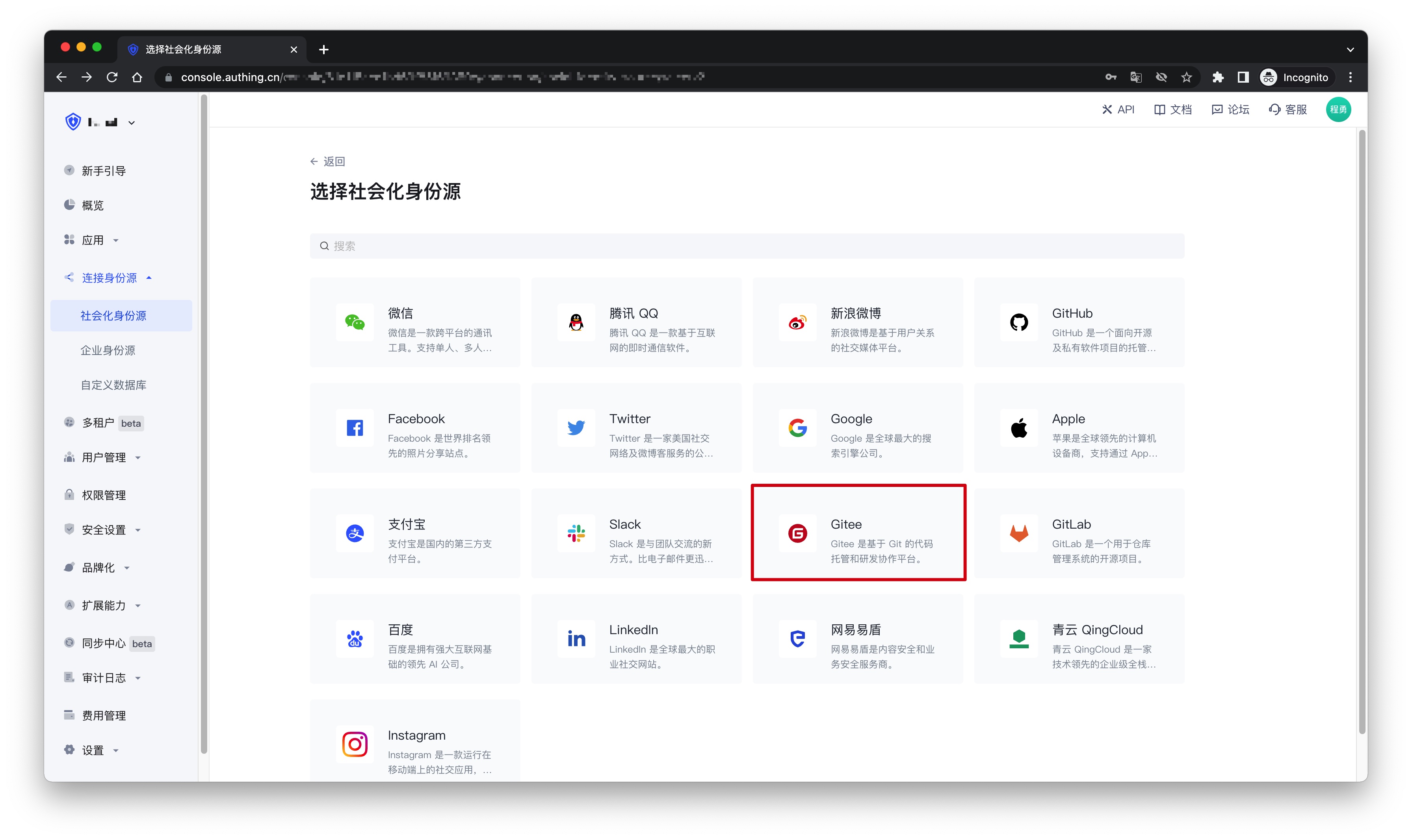 2.2 在「选择社会化身份源」页面,点击「Gitee」卡片。
