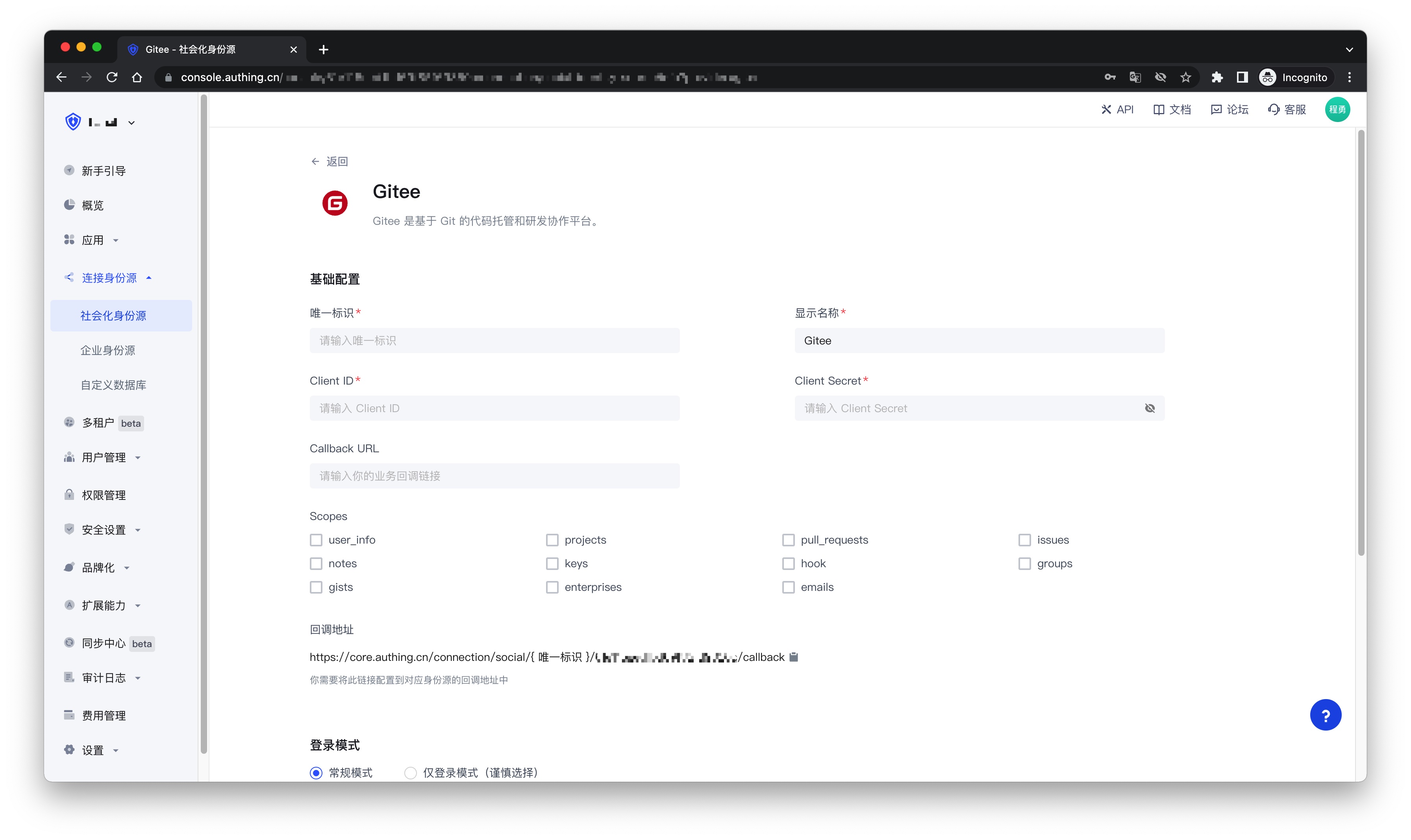 ¶ 第二步:在 Authing 控制台配置 Gitee 应用配置