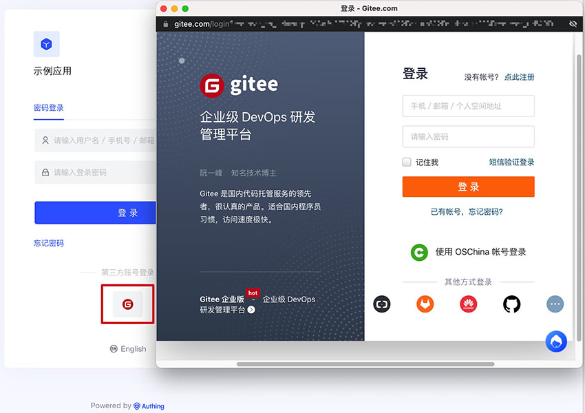 3.3 点击 Authing 控制台的应用「体验登录」按钮,在弹出的登录窗口体验「Gitee」登录