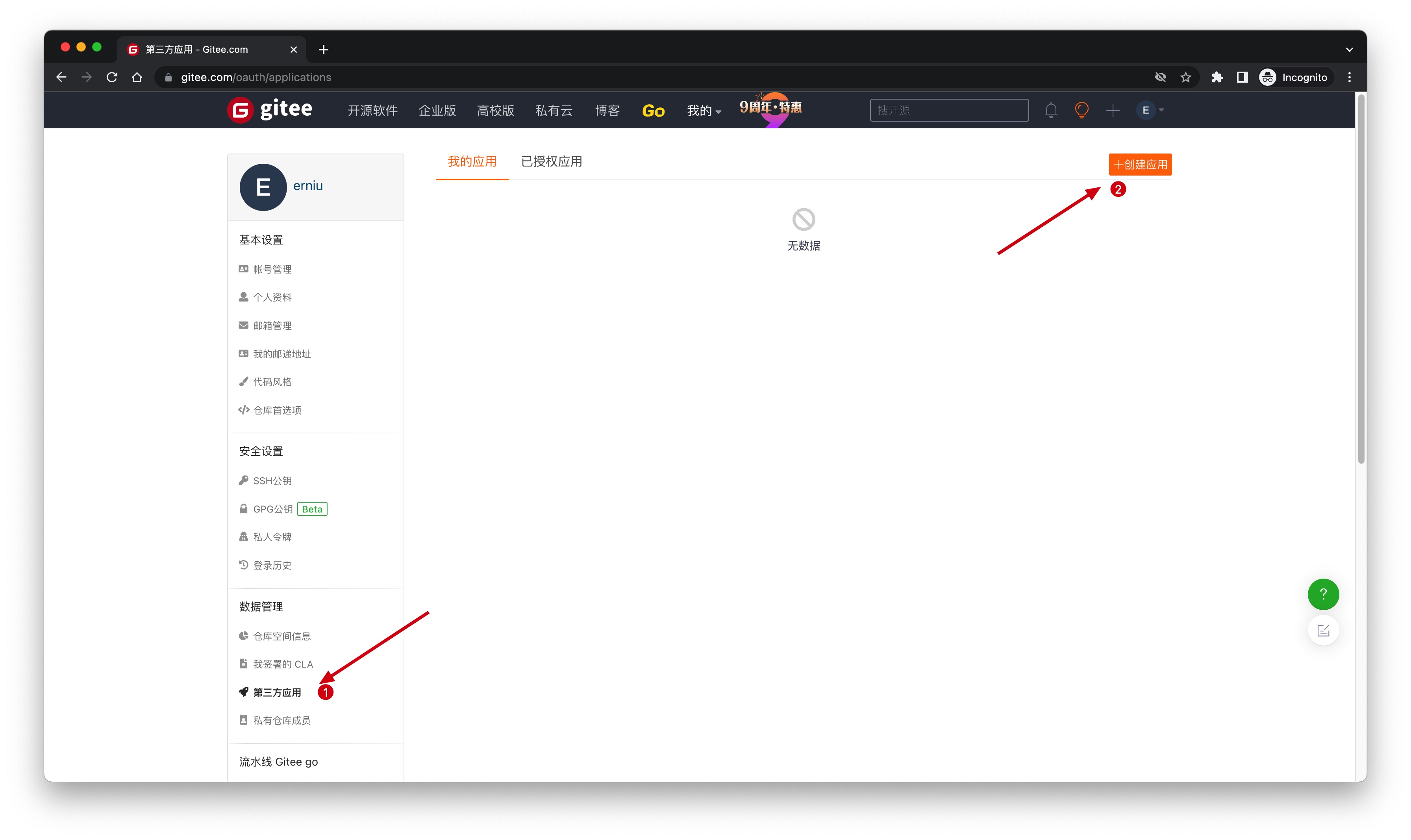 进入 Gitee 的应用管理页面,点击「创建应用」: