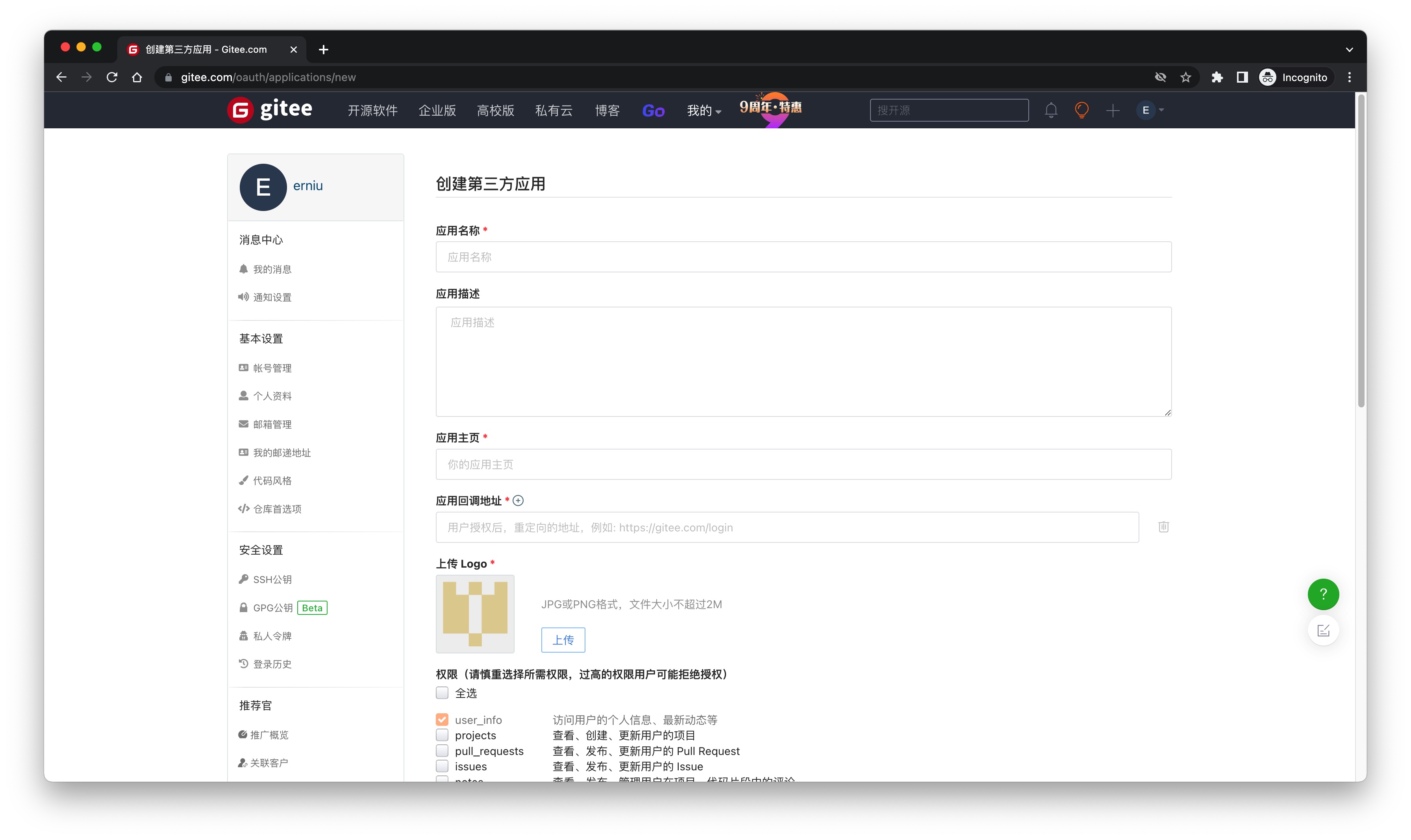 ¶ 第一步:在 Gitee 创建一个 OAuth 应用