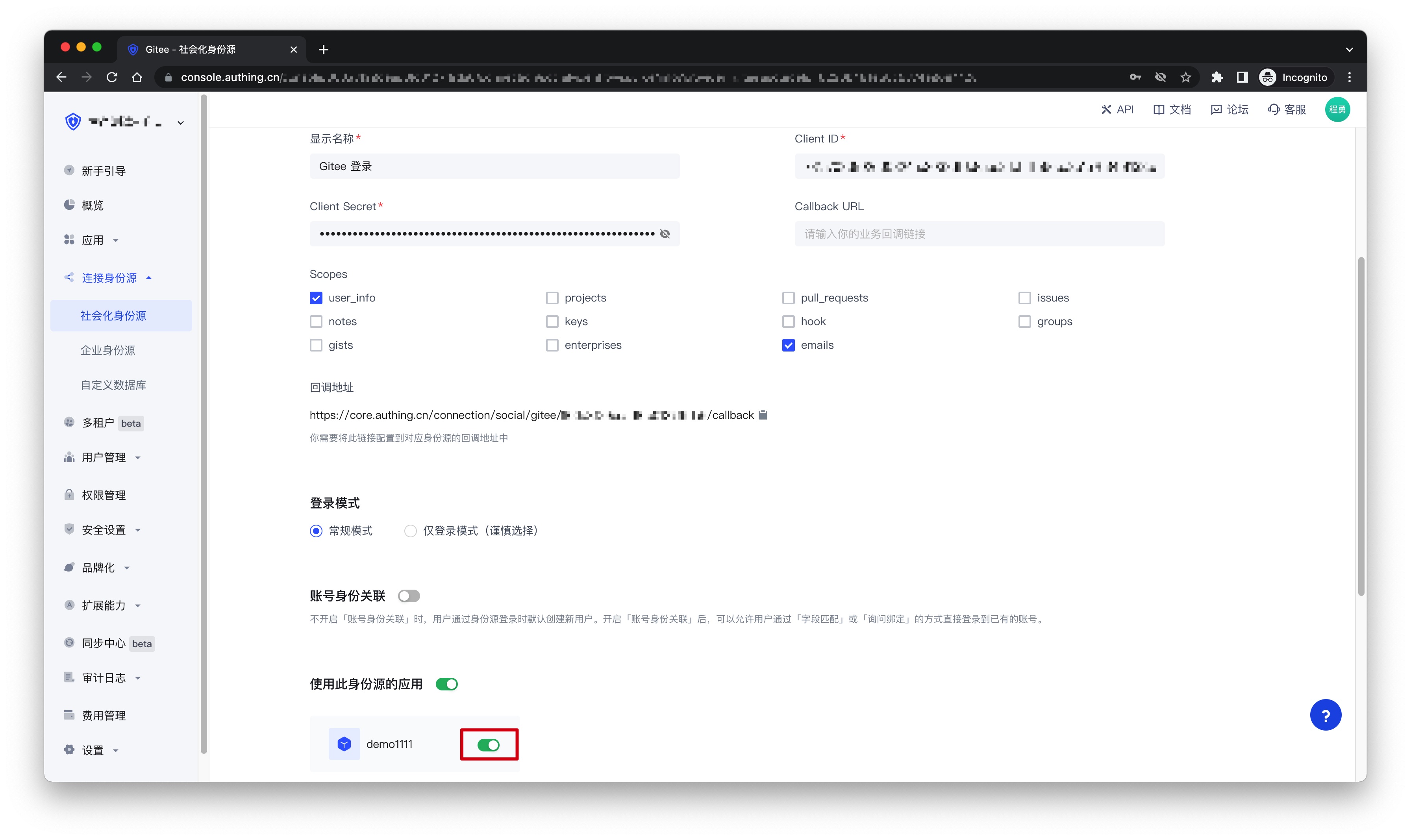 3.2 在已创建好的「Gitee」身份源连接详情页面,开启并关联一个在 Authing 控制台创建的应用