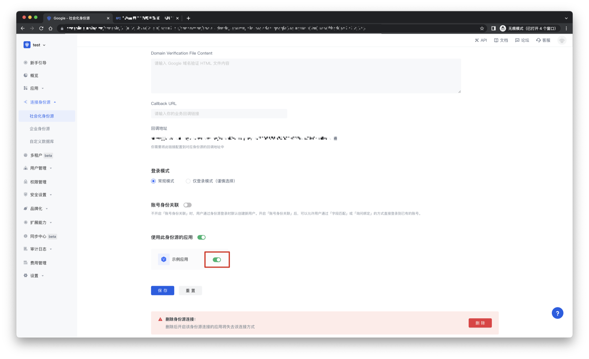 3.2 在已创建好的 Google 身份源连接详情页面,开启并关联一个在 Authing 控制台创建的应用