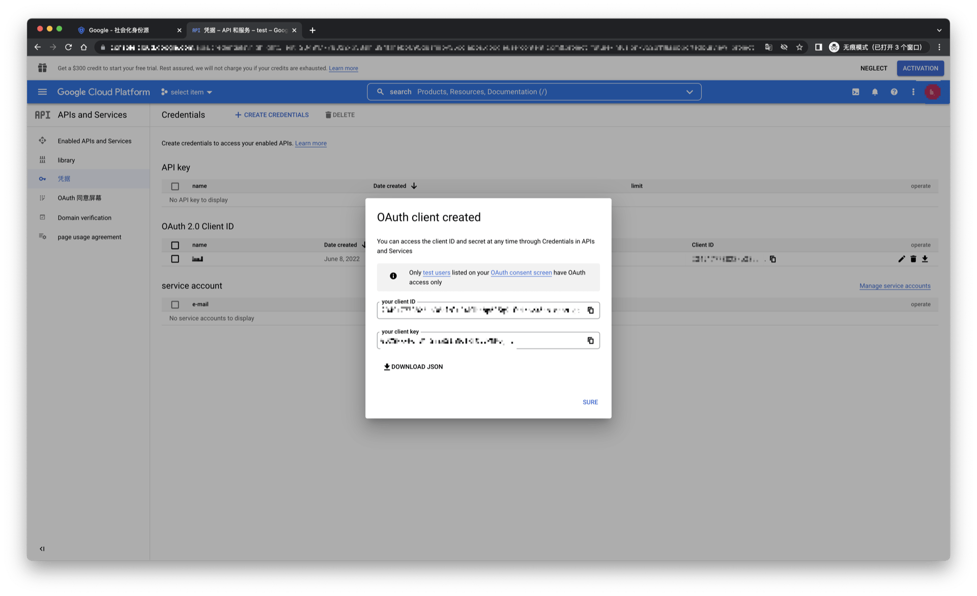 | Client secrets | Google 密钥,需要在 Google 开放平台上获取。 |