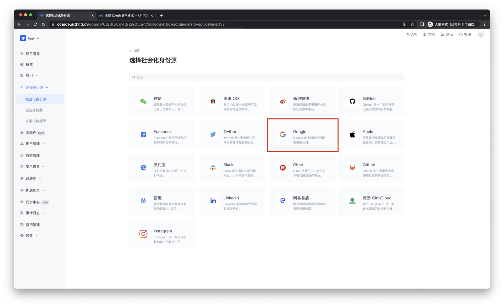 2.2 请在 Authing 控制台 的「社会化身份源」-「选择社会化身份源」页面,点击「Google」身份源按钮,进入 「Google 登录模式」页面。