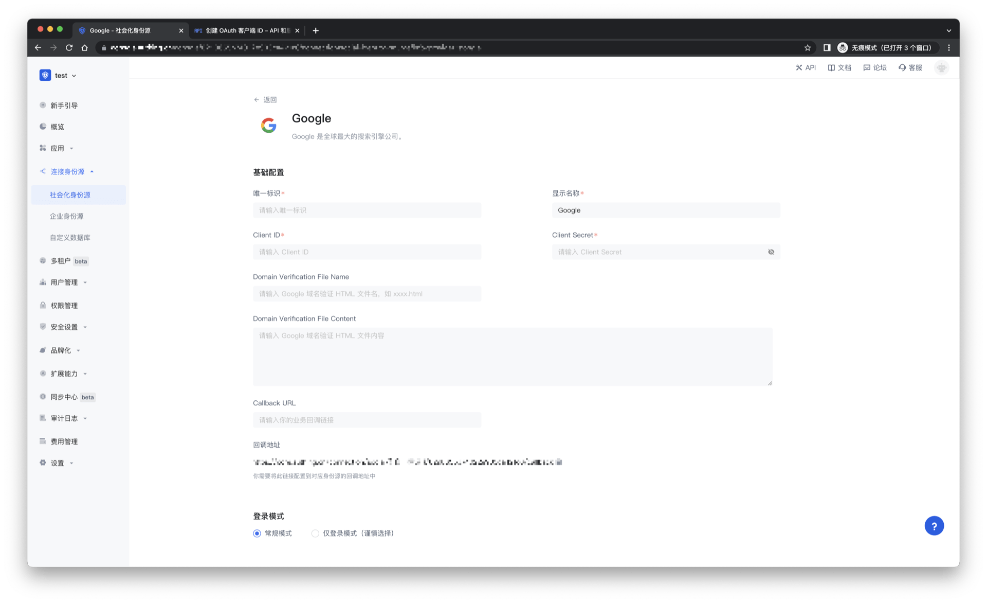 | 回调地址 | Google 有效跳转 URI。需要将此 URL 配置到 Google 开放平台上。 |