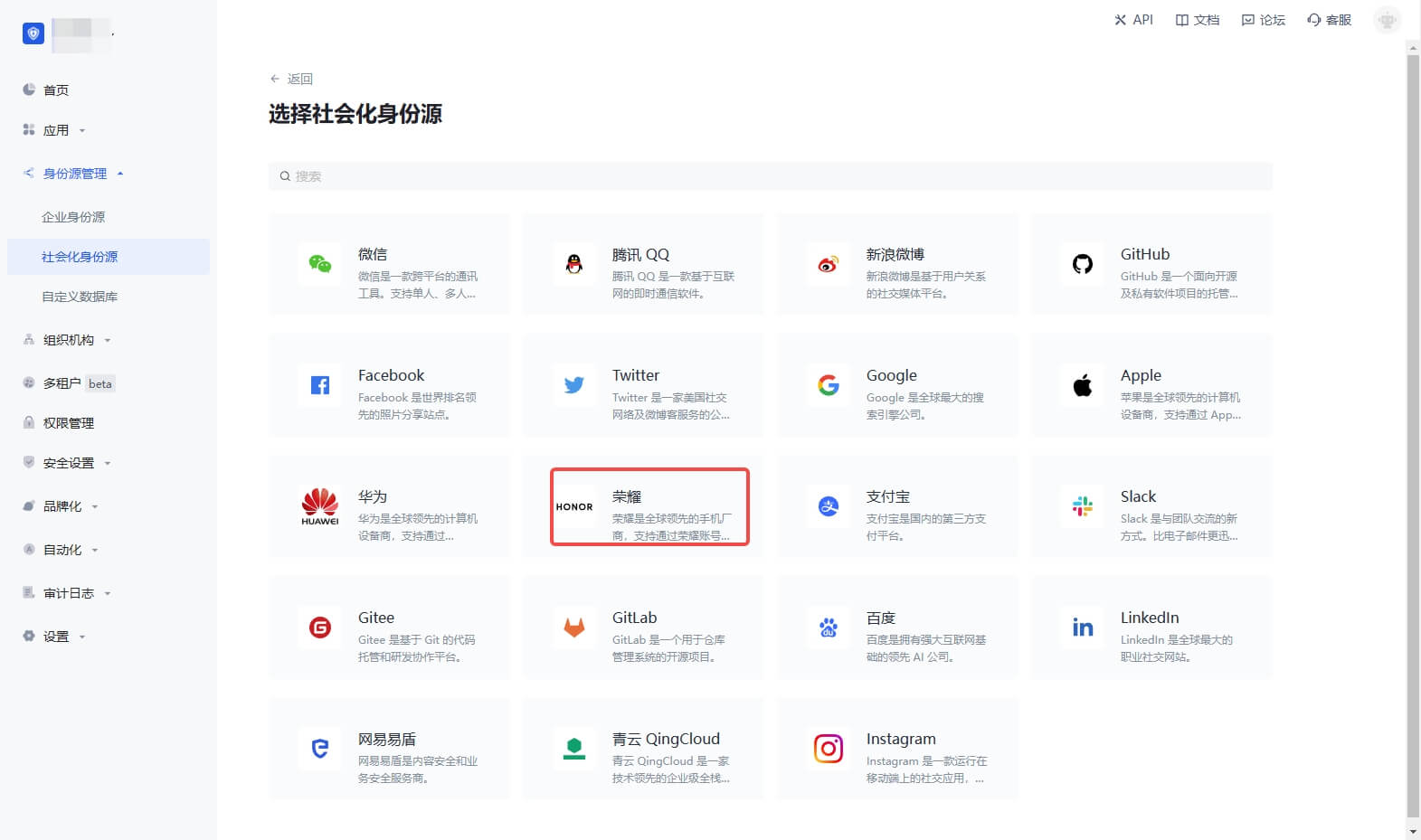 2.2 在「选择社会化身份源」页面,点击「荣耀」卡片。