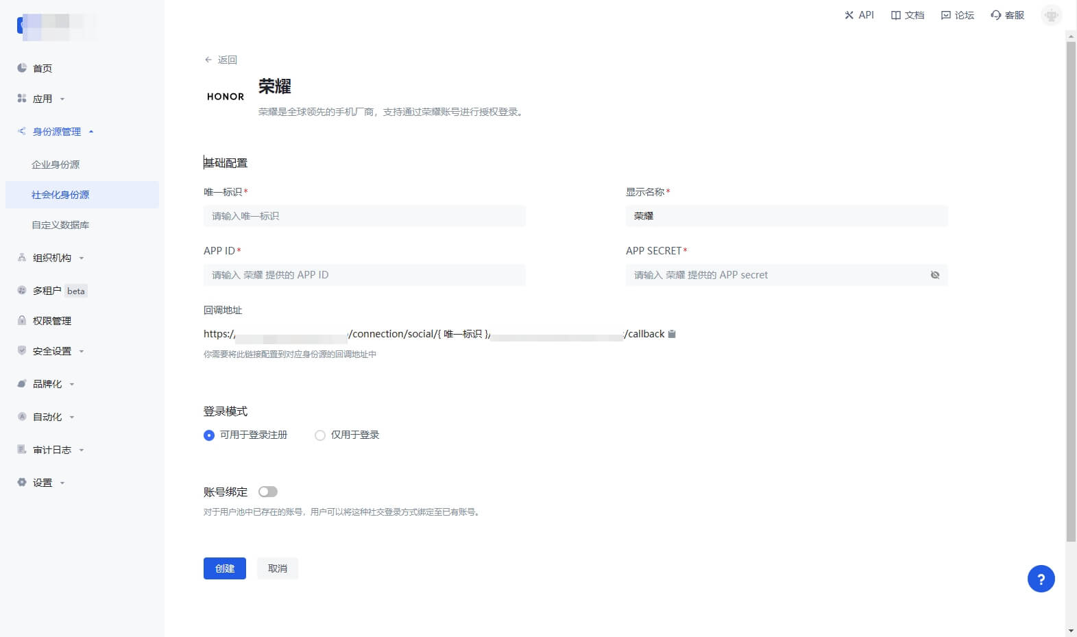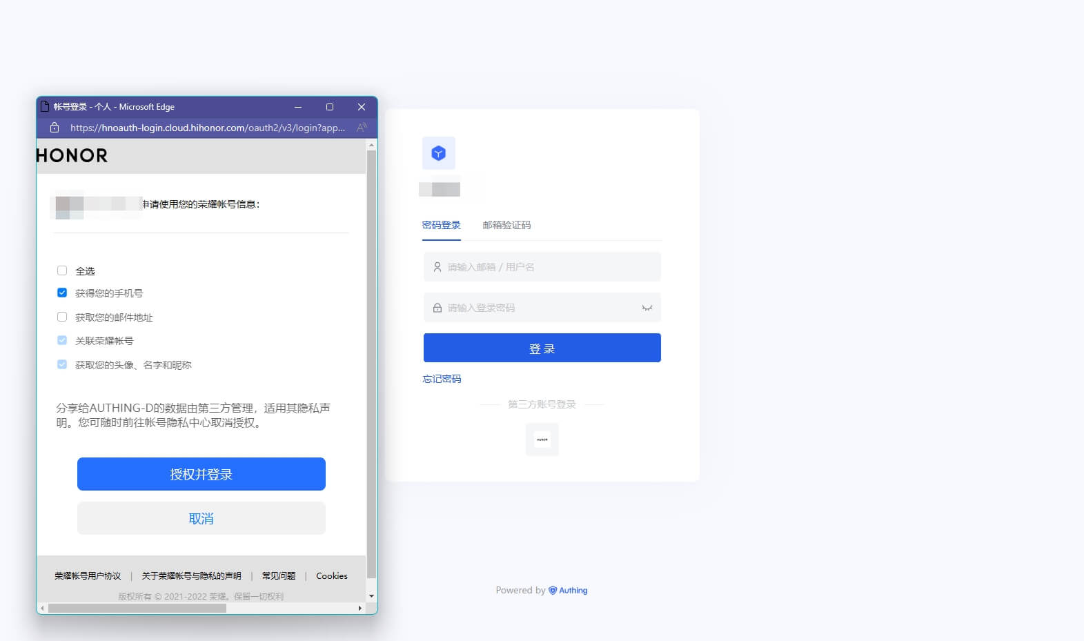 - 概述:荣耀 社会化登录是用户以 荣耀 为身份源安全登录第三方应用或者网站。在 Authing 中配置并开启 荣耀 的社会化登录,即可实现通过 Authing 快速获取 荣耀 基本开放的信息和帮助用户实现免密登录功能。