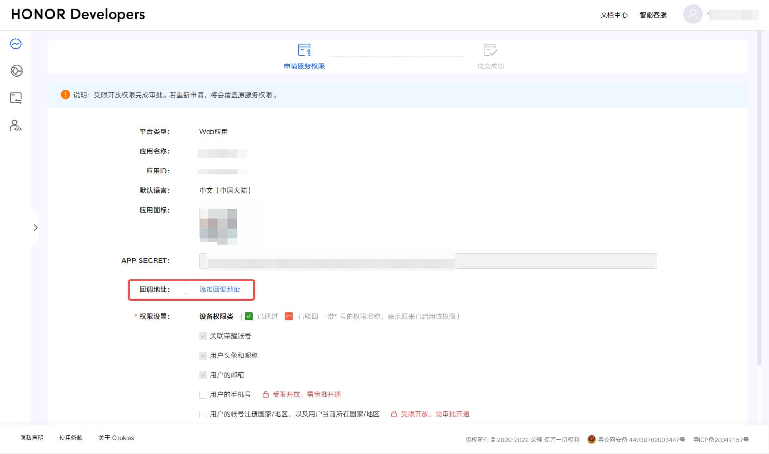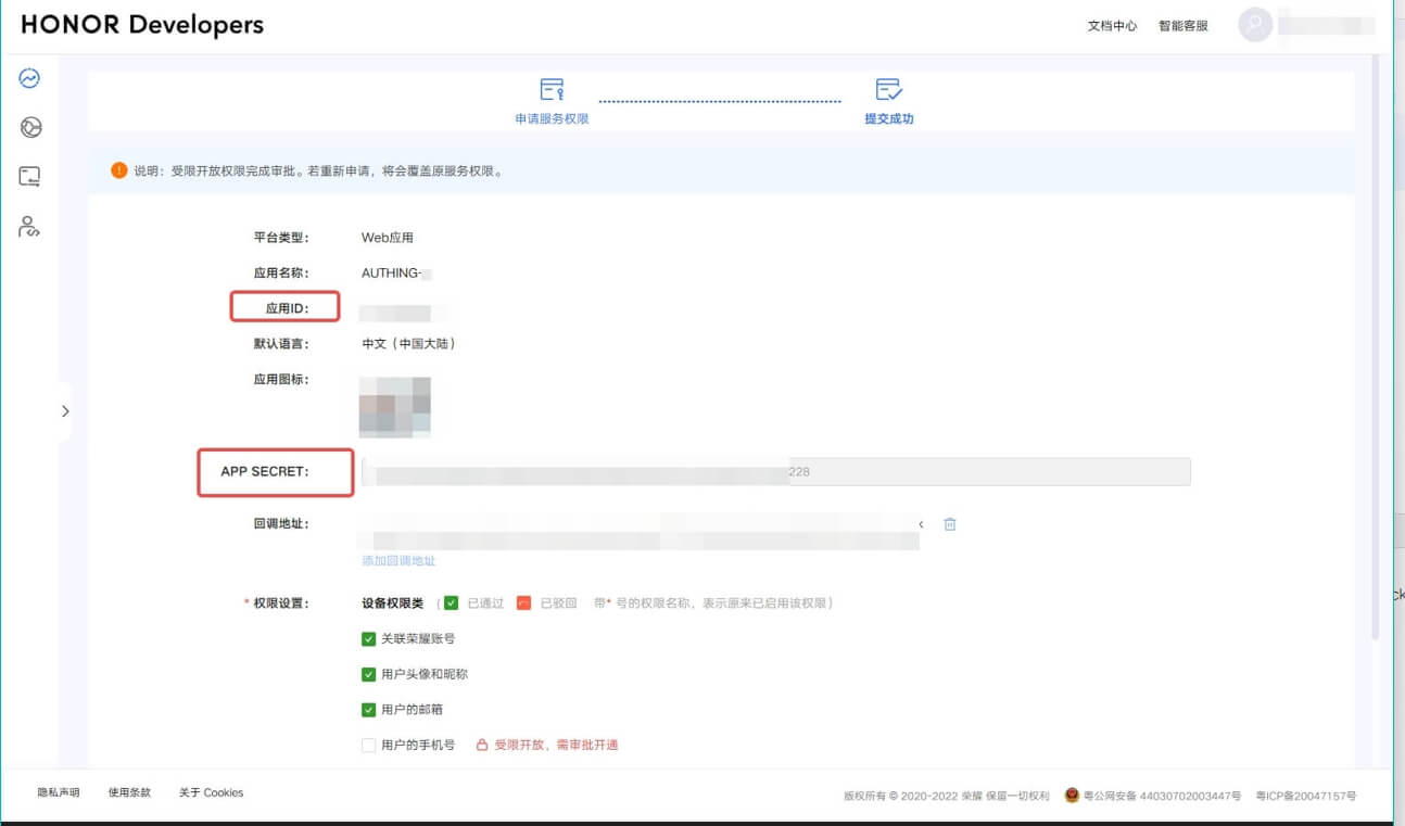 | APP Secret | 上一步获取的 荣耀 应用 Secret。 |