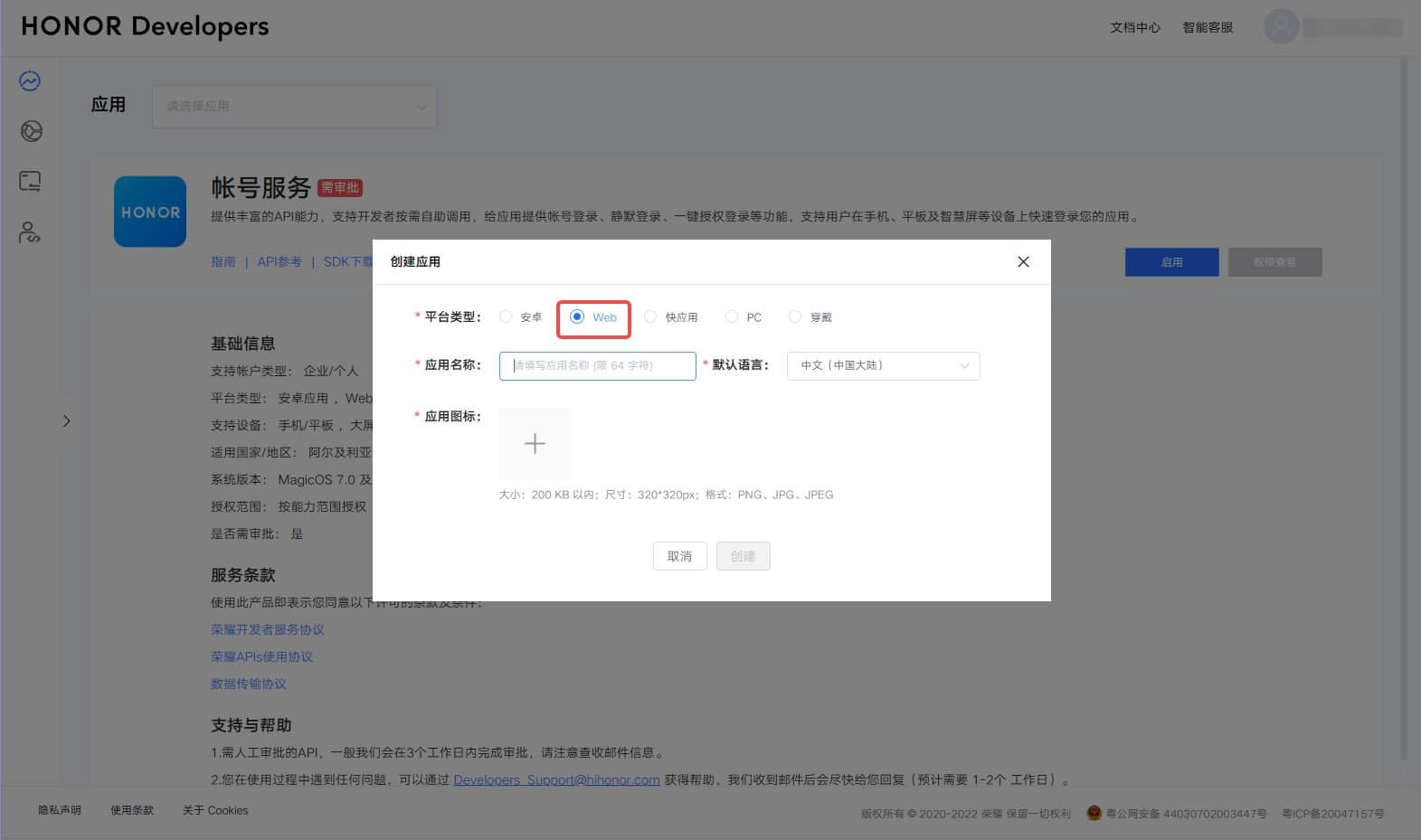 选择平台类型为Web → 填入应用名称 → 选择默认语言 → 上传应用图标 → 创建