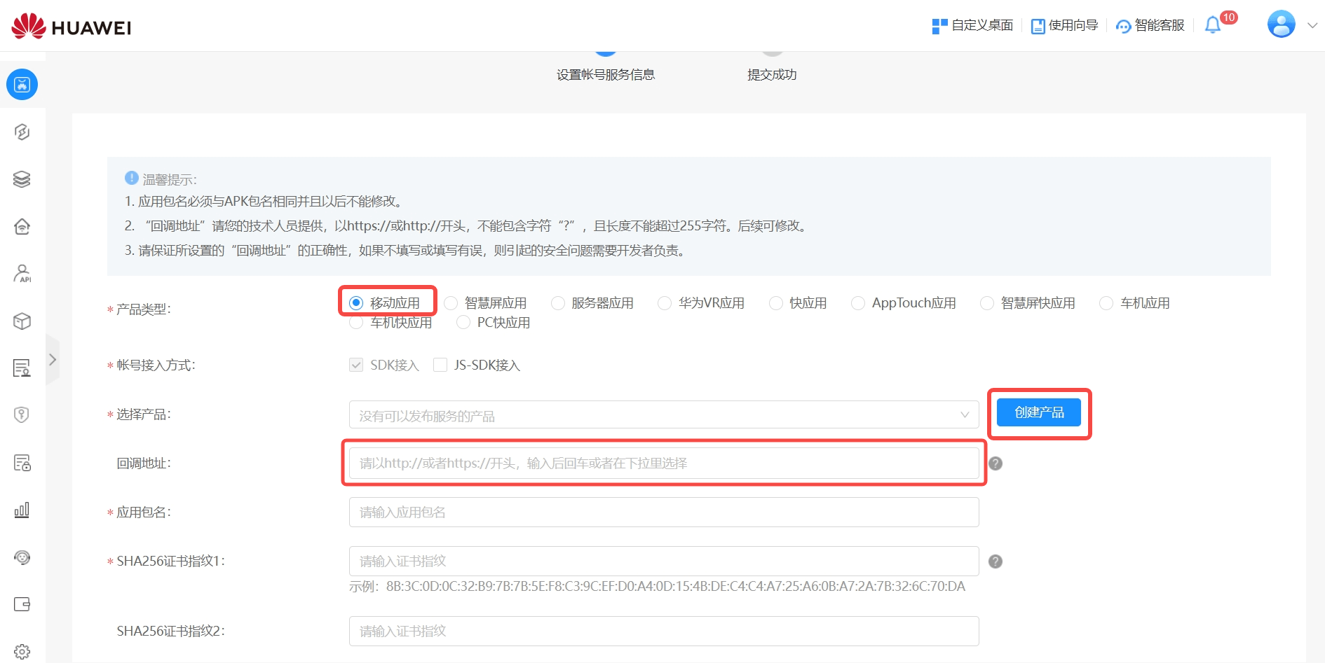选择产品类型,选择 创建产品,并配置应用的回调地址
