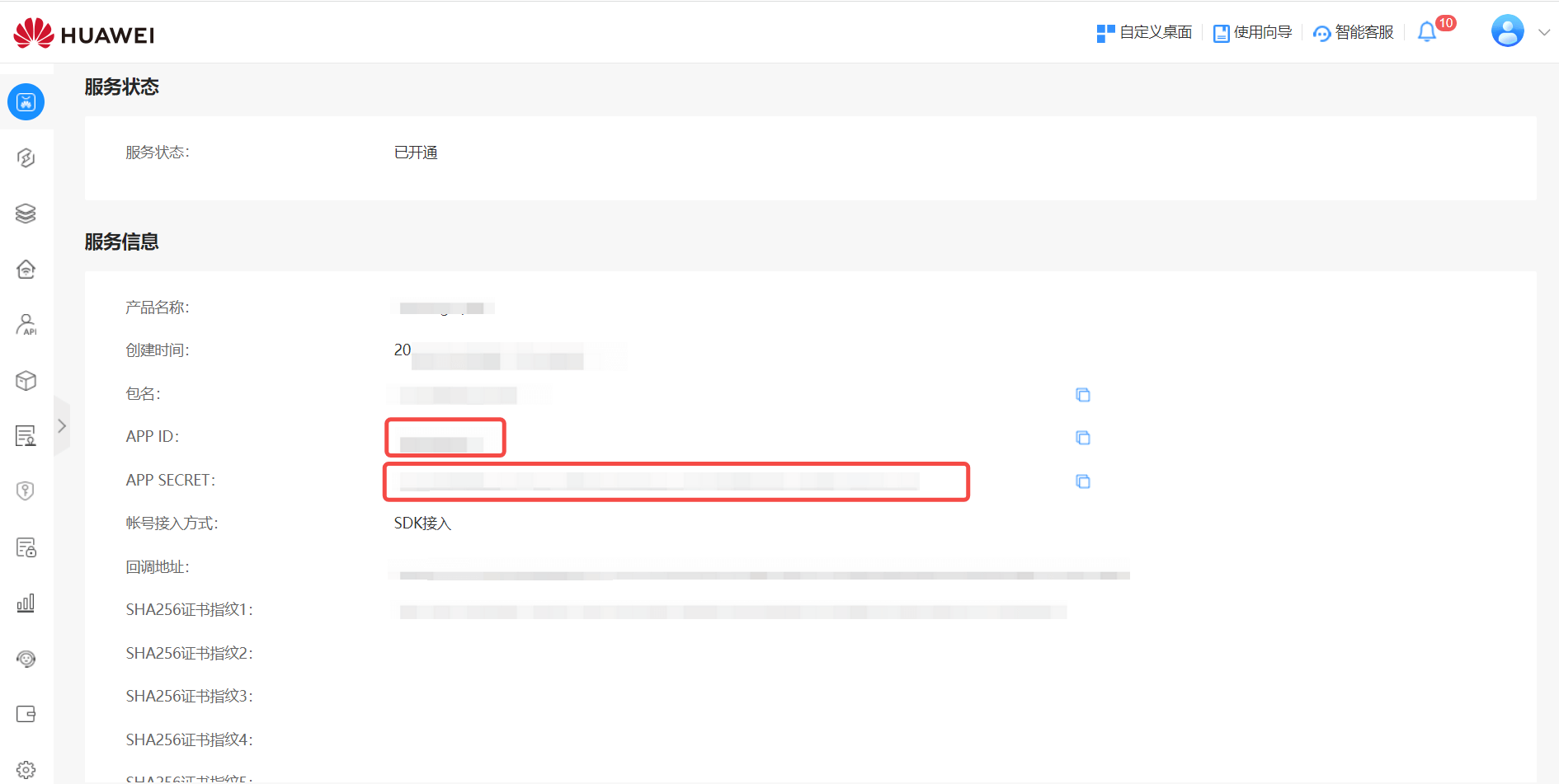 | APP Secret | 上一步获取的 华为 应用 Secret。 |