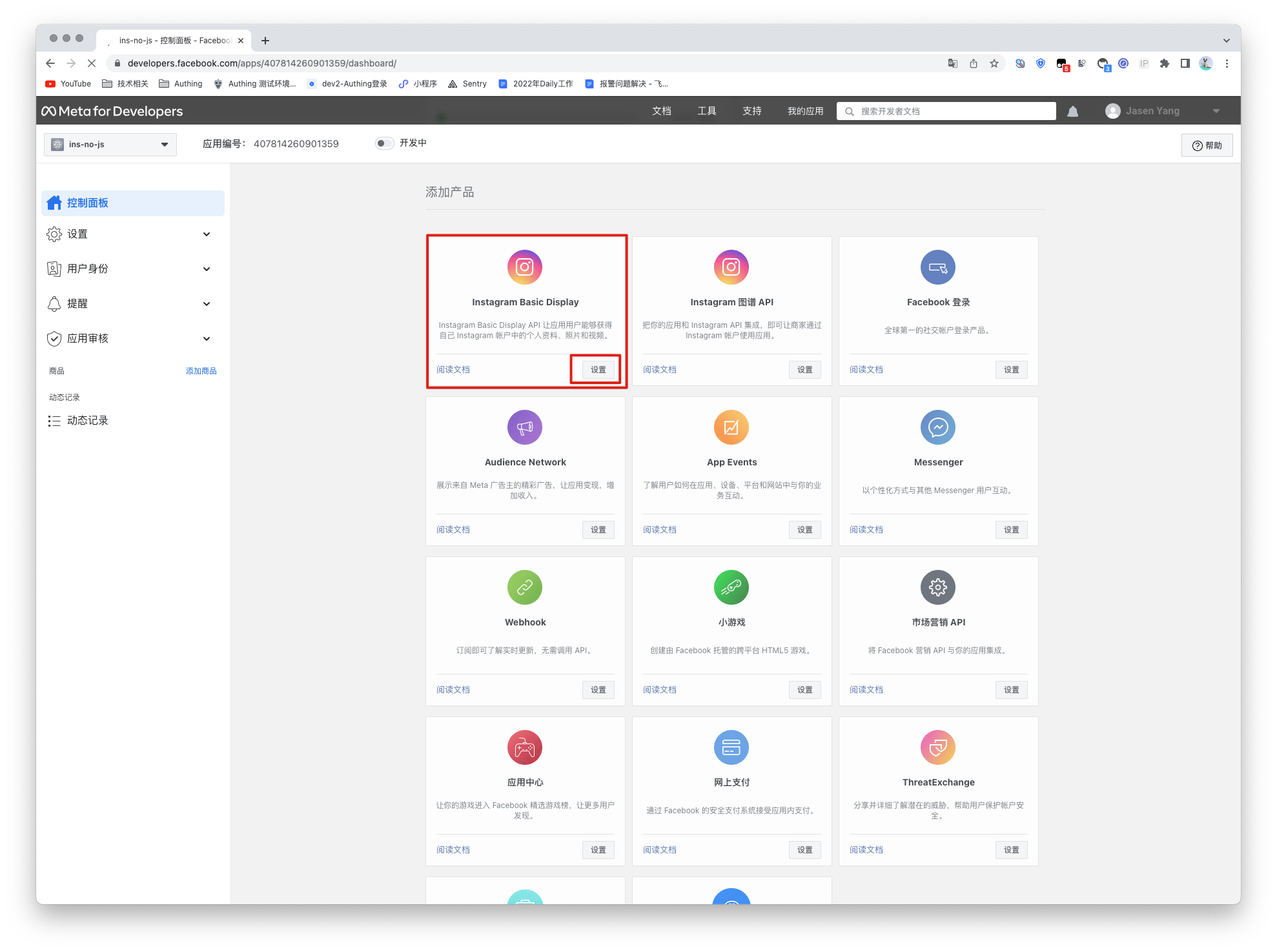在控制面板中,找到 Instagram Basic Display 产品,然后点击设置,将其添加至你的应用。