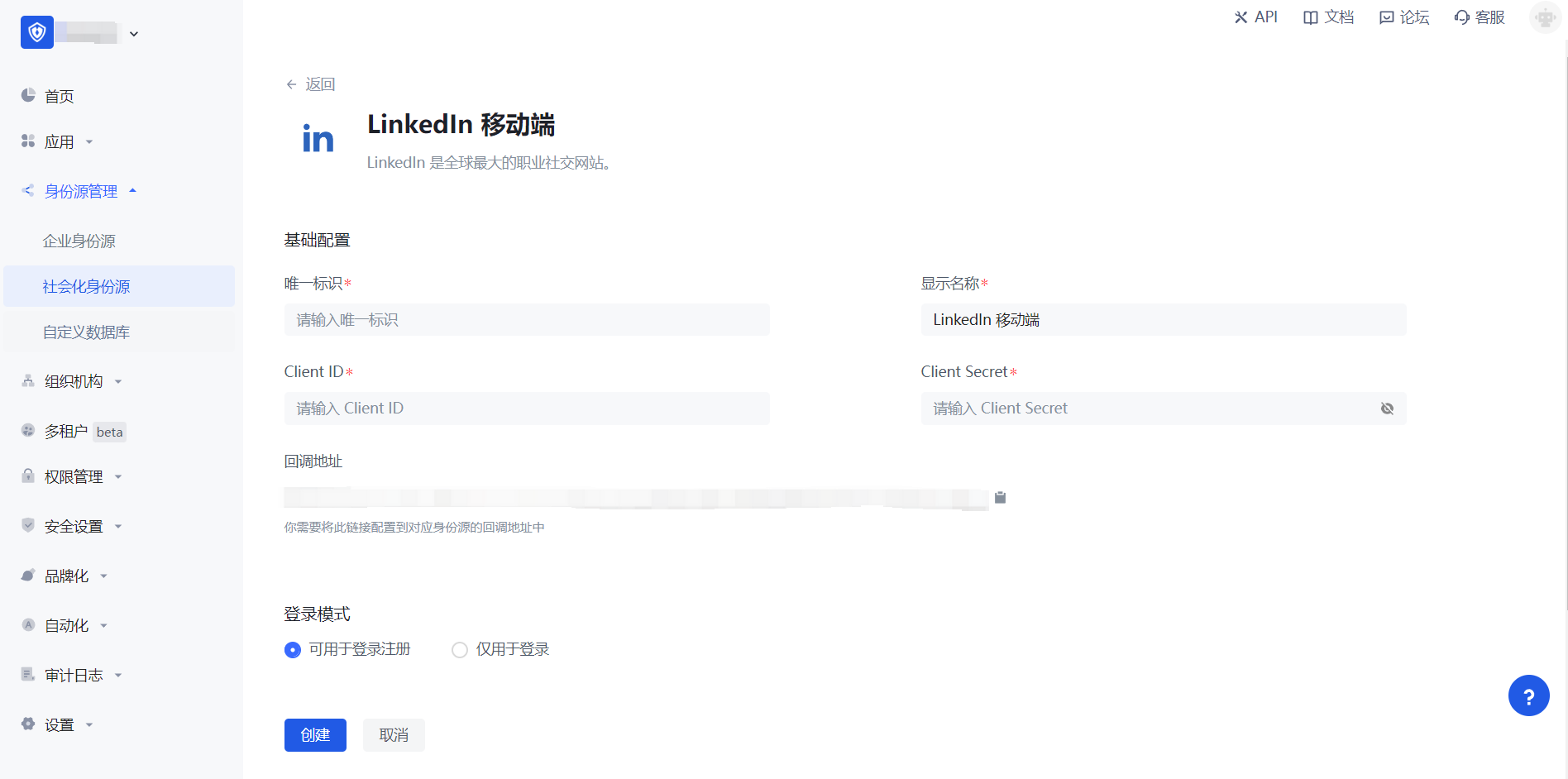 | 回调地址 | LinkedIn 有效跳转 URI。需要将此 URL 配置到 LinkedIn developers 上。 |