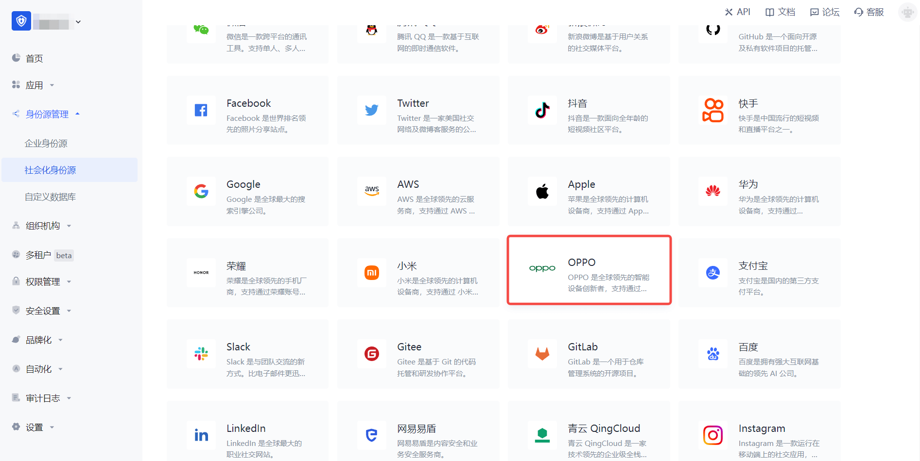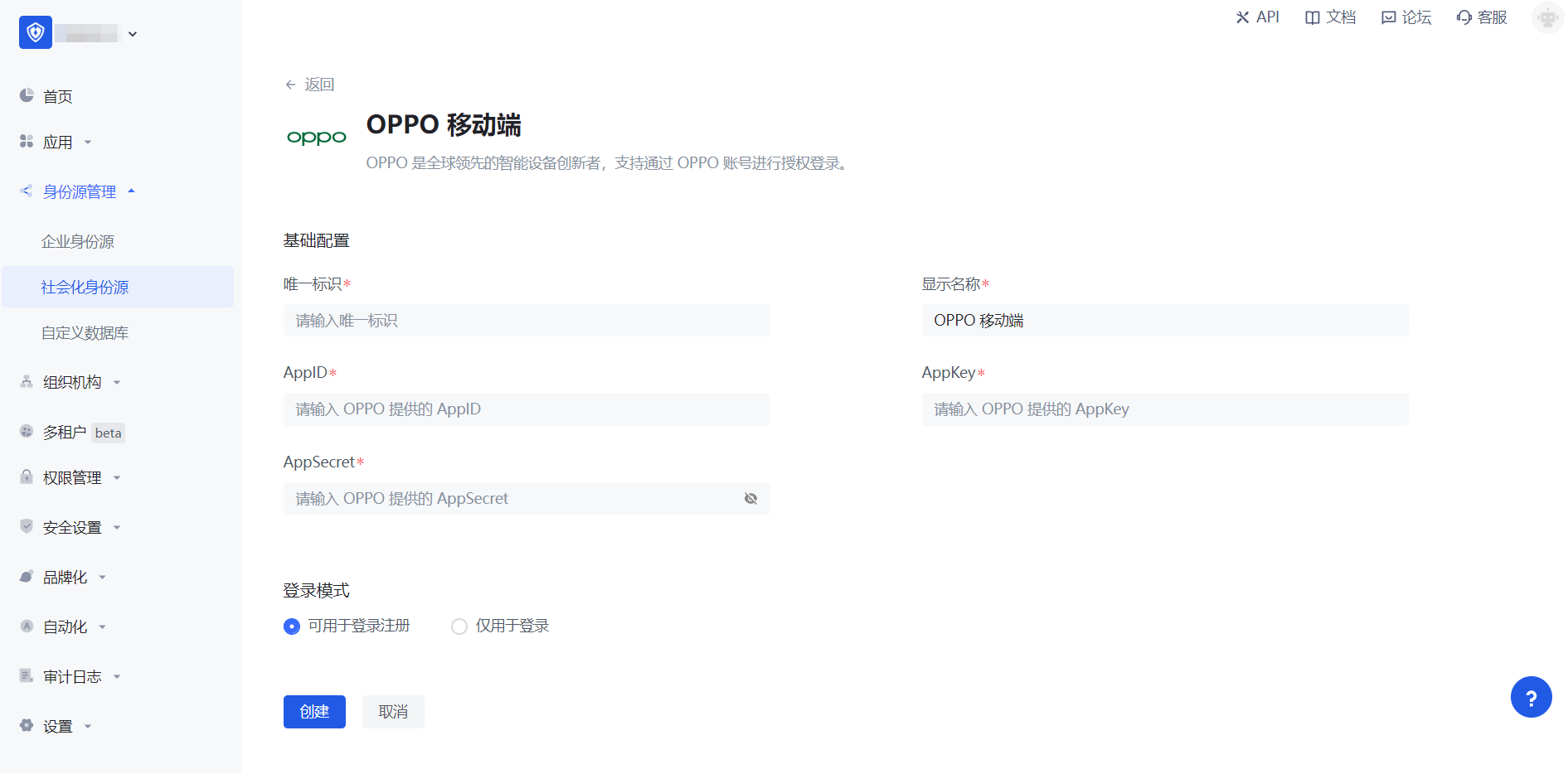 2.2 请在 Authing 控制台 的「社会化身份源」-「选择社会化身份源」页面,点击「OPPO」身份源按钮,进入 「OPPO 移动端登录模式」页面。