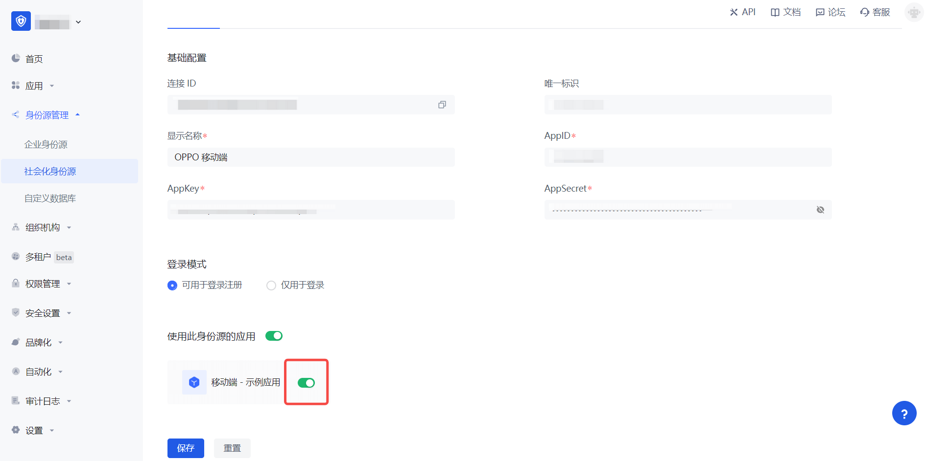 2.3 请在 Authing 控制台 的「社会化身份源」-「OPPO 移动端」页面,配置相关的字段信息。