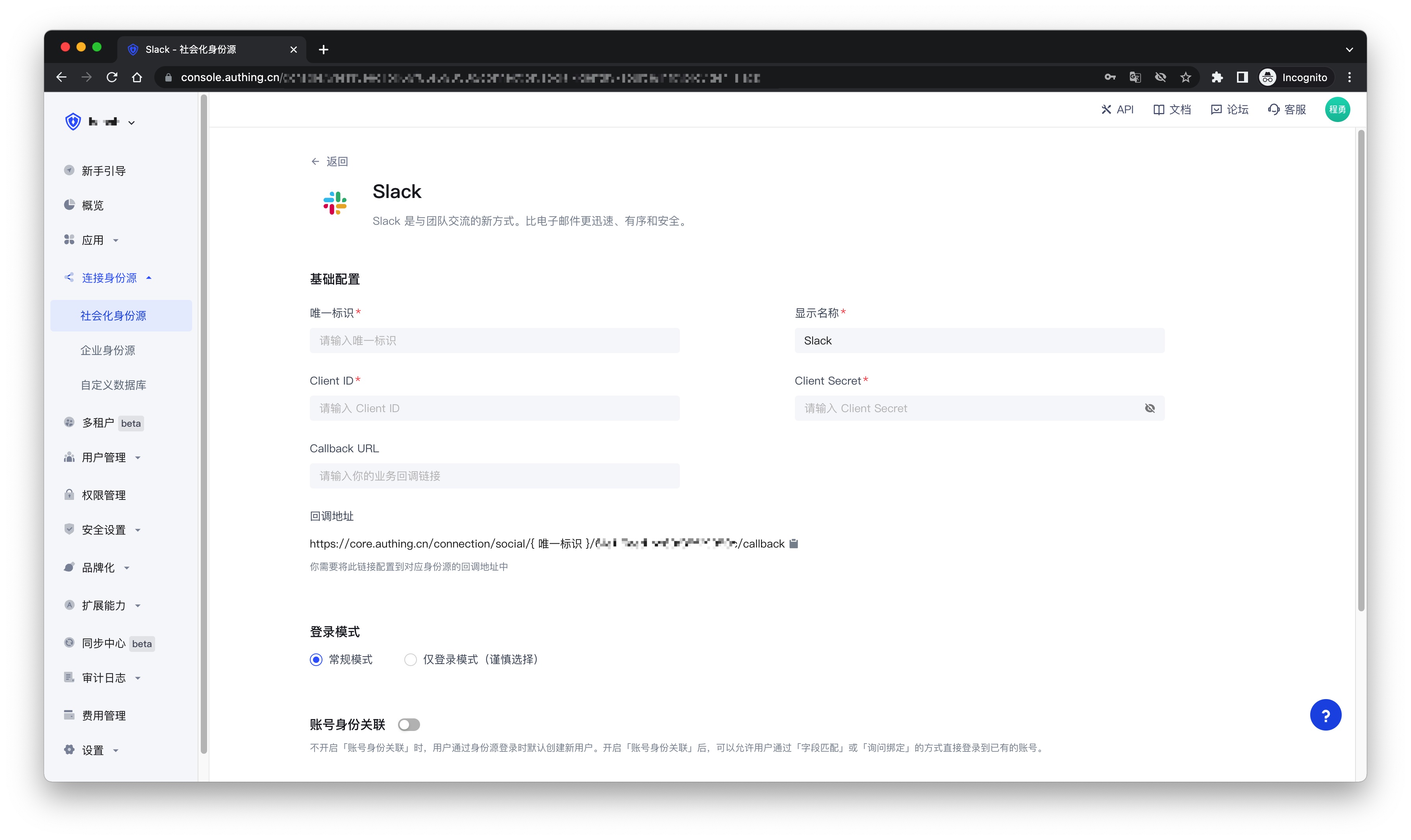 - 概述:Slack 社会化登录是用户以 Slack 为身份源安全登录第三方应用或者网站。在 Authing 中配置并开启 Slack 的社会化登录,即可实现通过 Authing 快速获取 Slack 基本开放的信息和帮助用户实现免密登录功能。