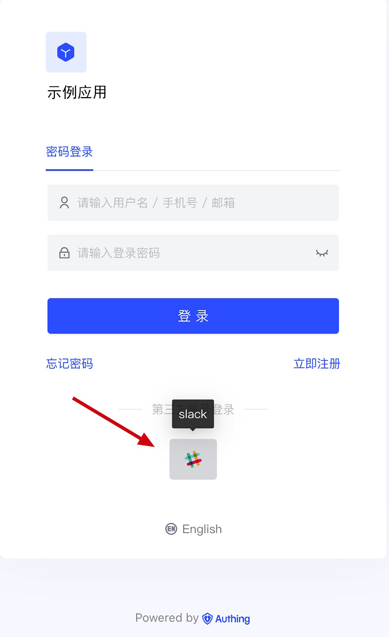 3.3 点击 Authing 控制台的应用「体验登录」按钮,在弹出的登录窗口体验「Slack」登录