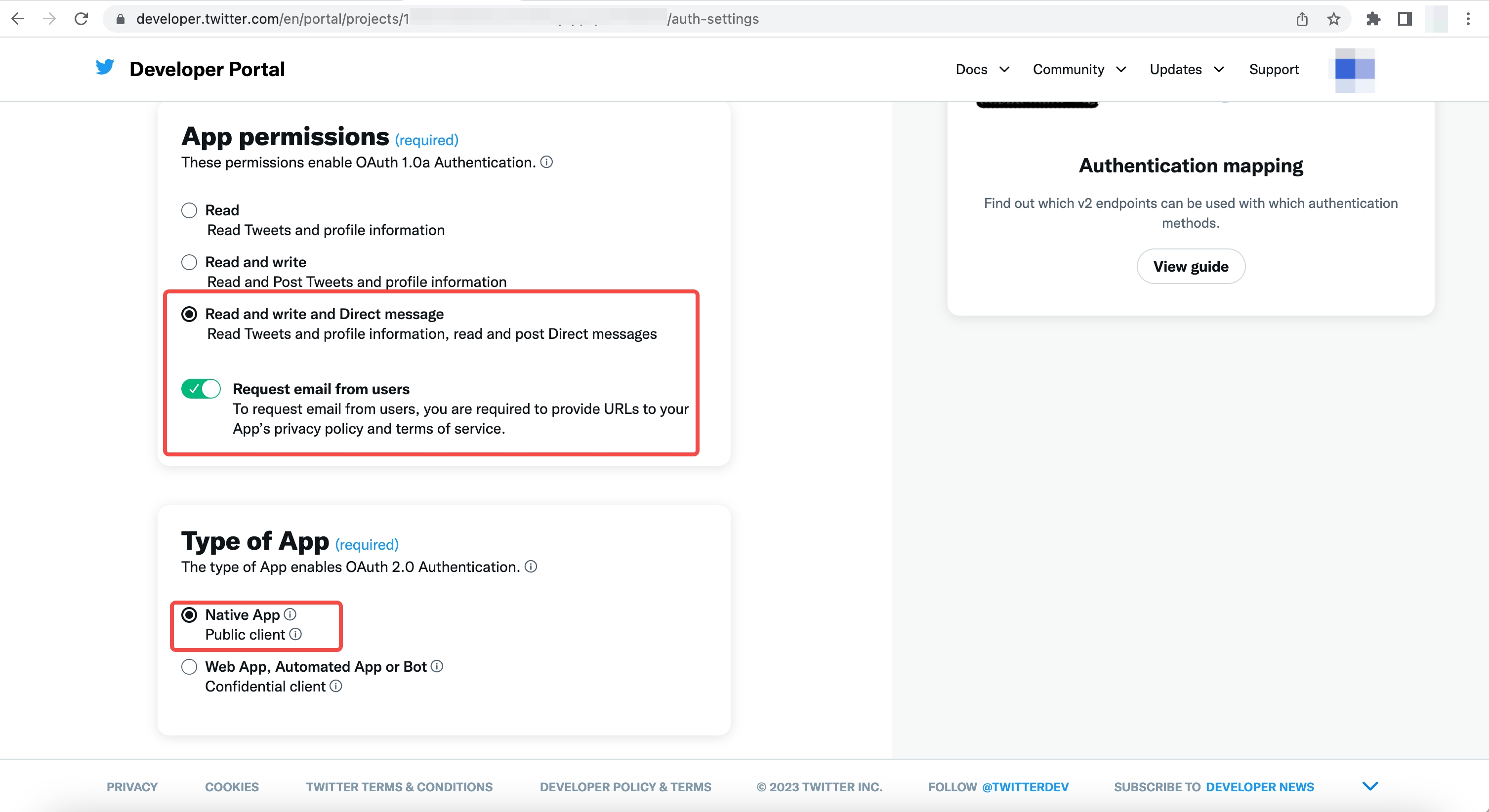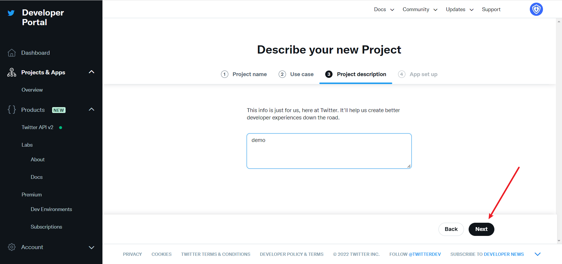 - 前往 Twitter 开发者平台 (opens new window)完善账号信息, 并为账号申请 Elevated access 权限 (opens new window)。