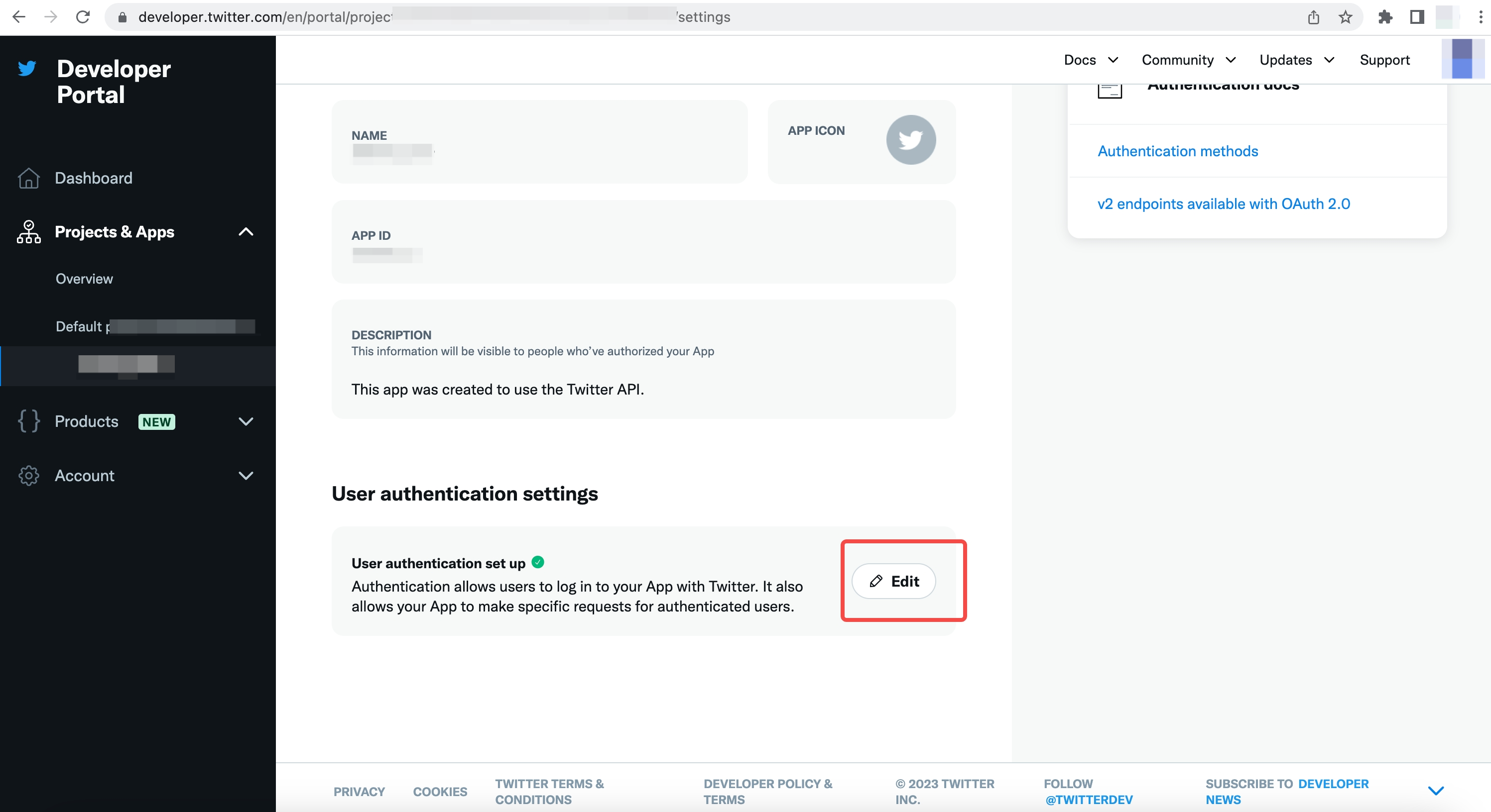在 Twitter 创建的项目,选择刚刚创建的应用,滑动到下方,在 User authentication settings 栏目下,点击 Set Up 按钮,进入认证设置页