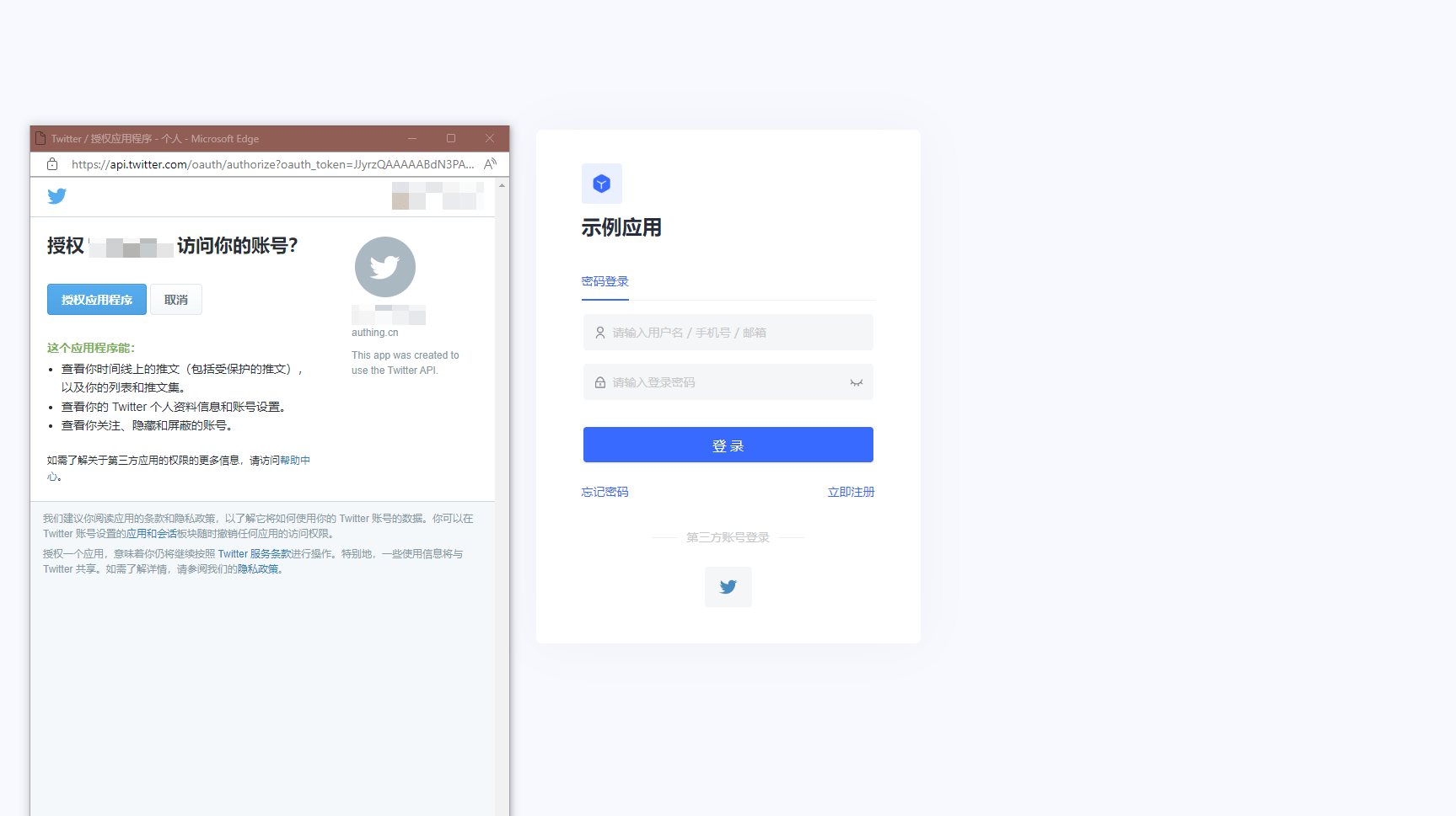 - 概述 Twitter 社会化登录是用户以 Twitter 为身份源安全登录第三方应用或者网站。在 Authing 中配置并开启 Twitter 的社会化登录,即可实现通过 Authing 快速获取 Twitter 基本开放的信息和帮助用户实现免密登录功能。