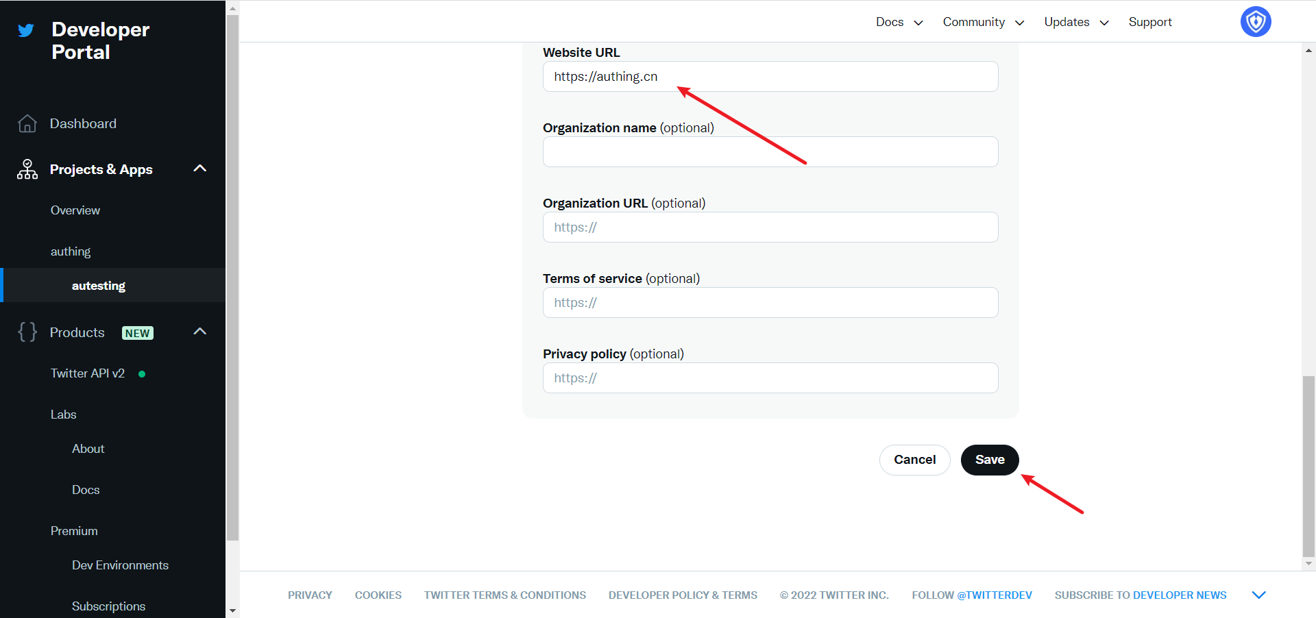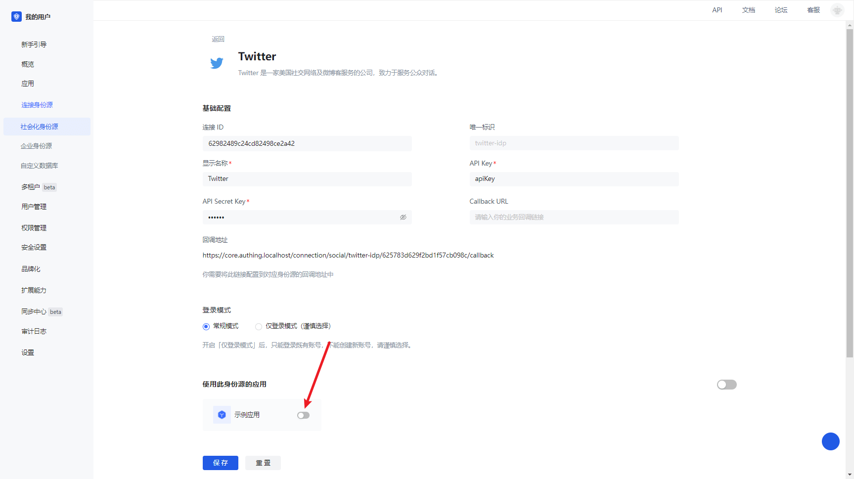 2.3 请在 Authing Console 控制台 的「社会化身份源」-「Twitter」页面,配置相关的字段信息。