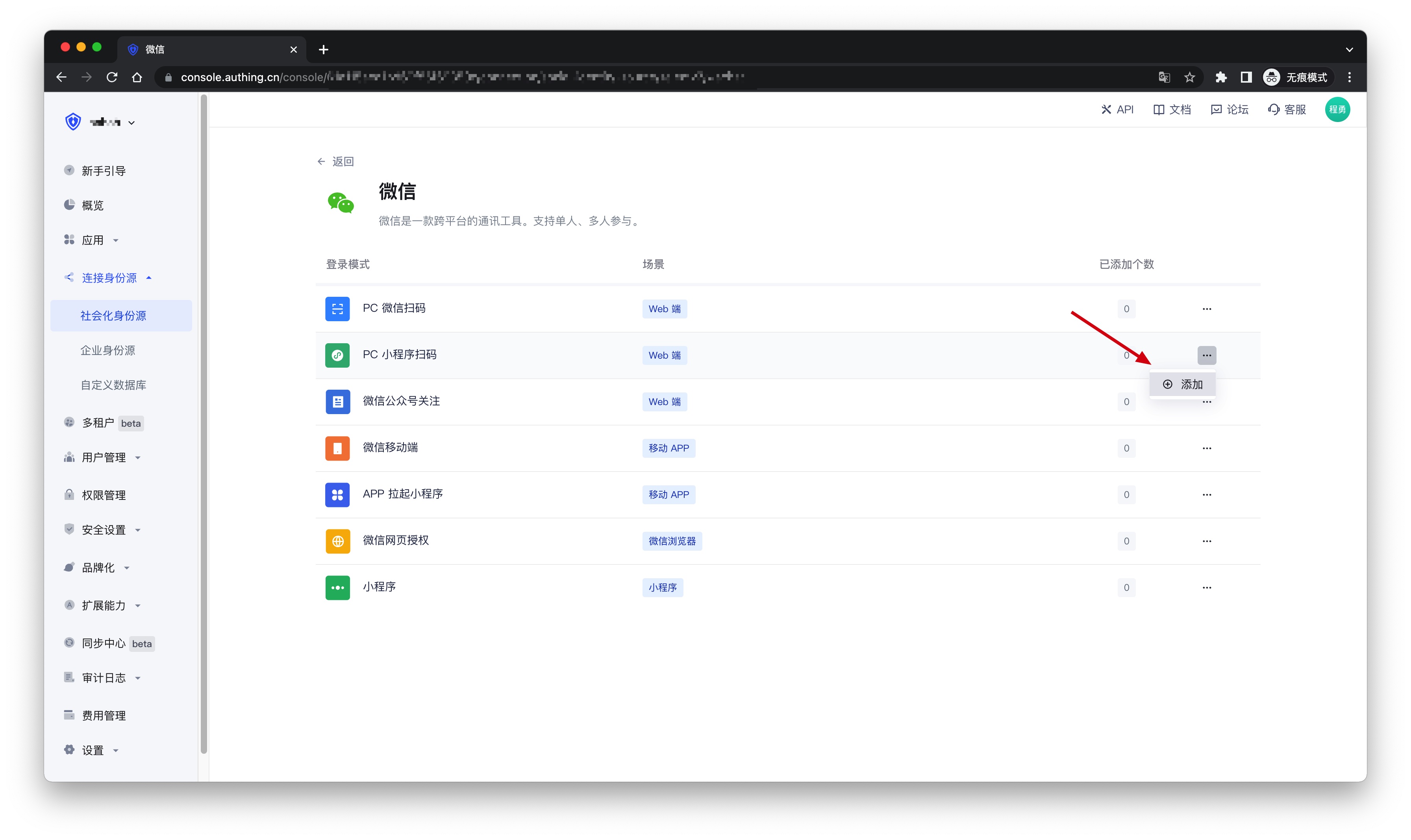2.3 继续点击 PC 小程序扫码 登录模式,或者点击 添加 打开 PC 小程序扫码 配置页面。