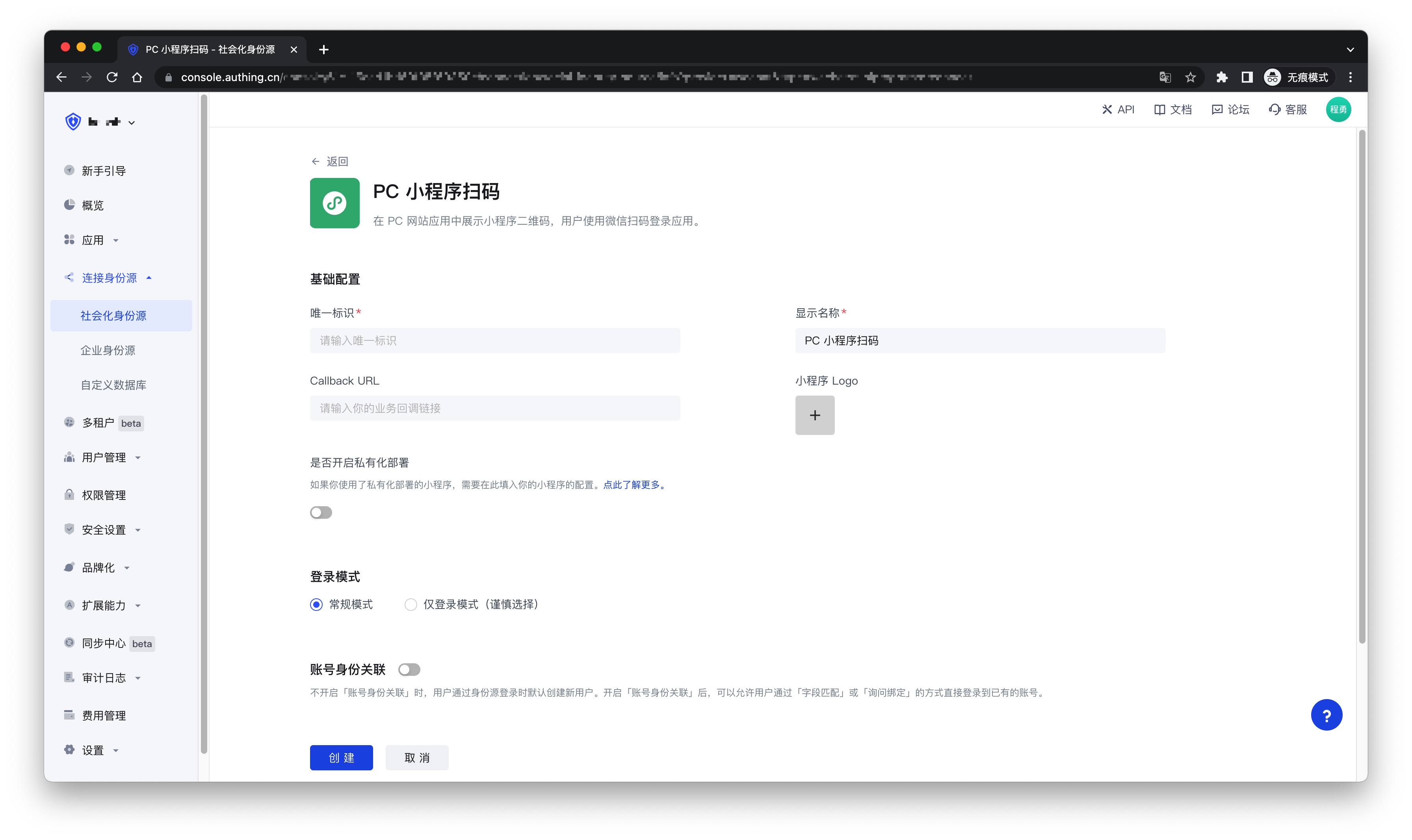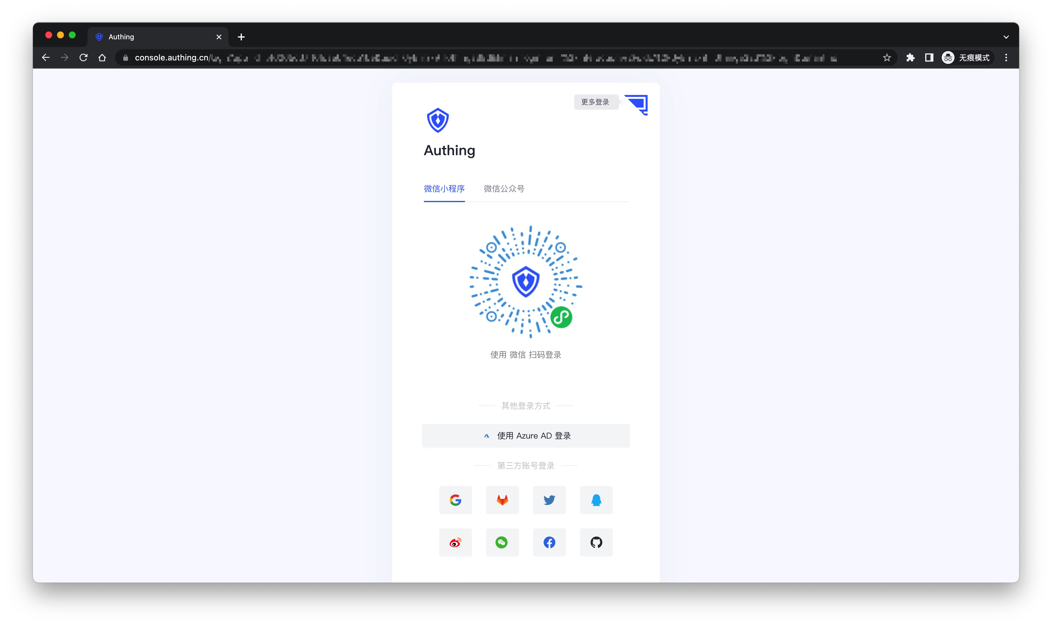 默认情况下,小程序扫码登录会使用 Authing 提供的默认小程序,如果你需要有更强的品牌定制能力,或者想让通过小程序扫码登录的用户微信账号和自己的其他微信公众平台打通,你需要申请自己的小程序。