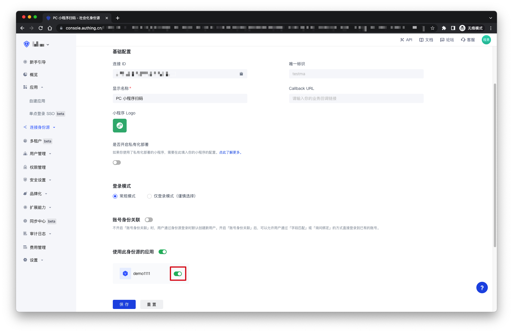 3.2 在已创建好的 PC 小程序扫码 身份源连接详情页面,开启并关联一个在 Authing 控制台创建的应用
