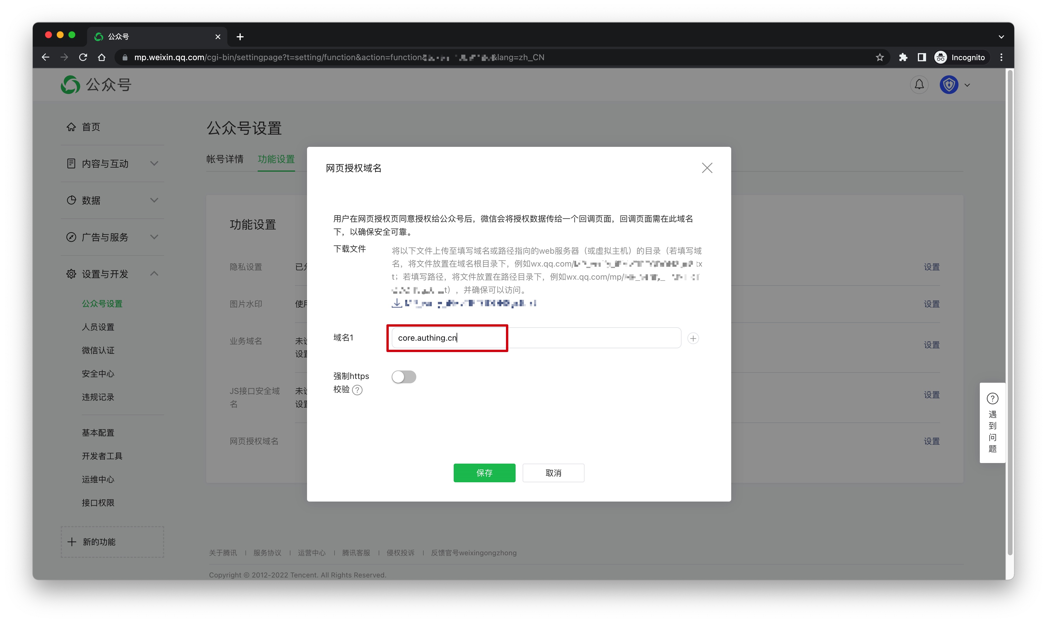 之后需在微信公众平台后台的 设置与开发 -> 公众号设置 -> 功能设置 页面中,设置 网页授权域名 为core.authing.cn。 出于安全验证考虑,微信服务器需要和 Authing 服务器做一次请求验证,开发者需要下载 txt 文件,并记录 文件名 和 文本内容。