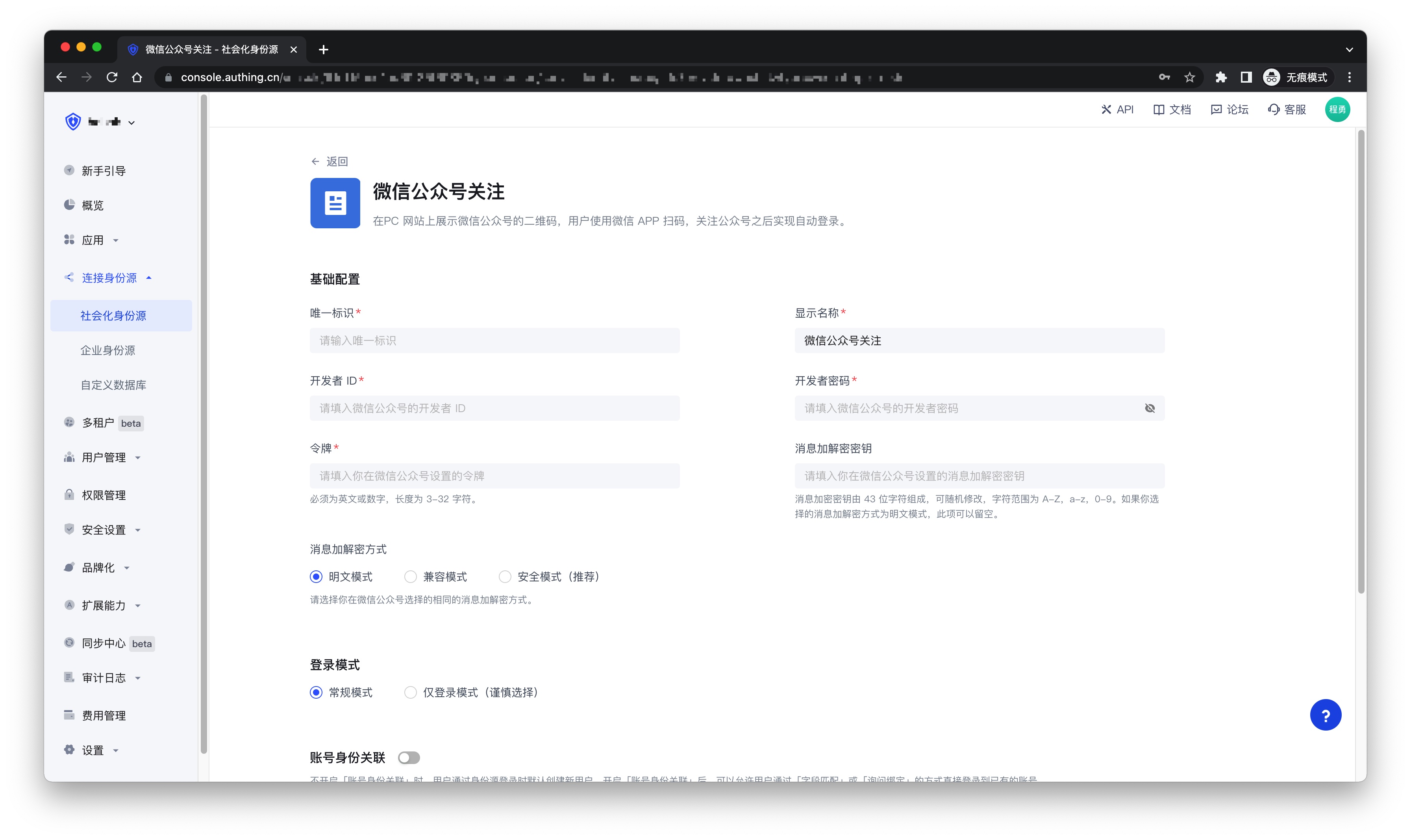 ¶ 第二步:在 Authing 控制台配置微信公众号关注