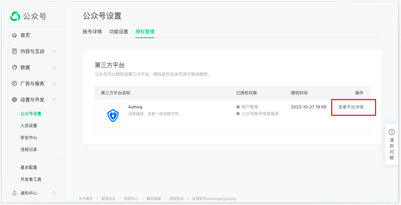 - 进入「授权管理」页面,确认信息后,点击下方「取消授权」按钮,即可取消当前公众号对 Authing 作为第三方平台的授权;