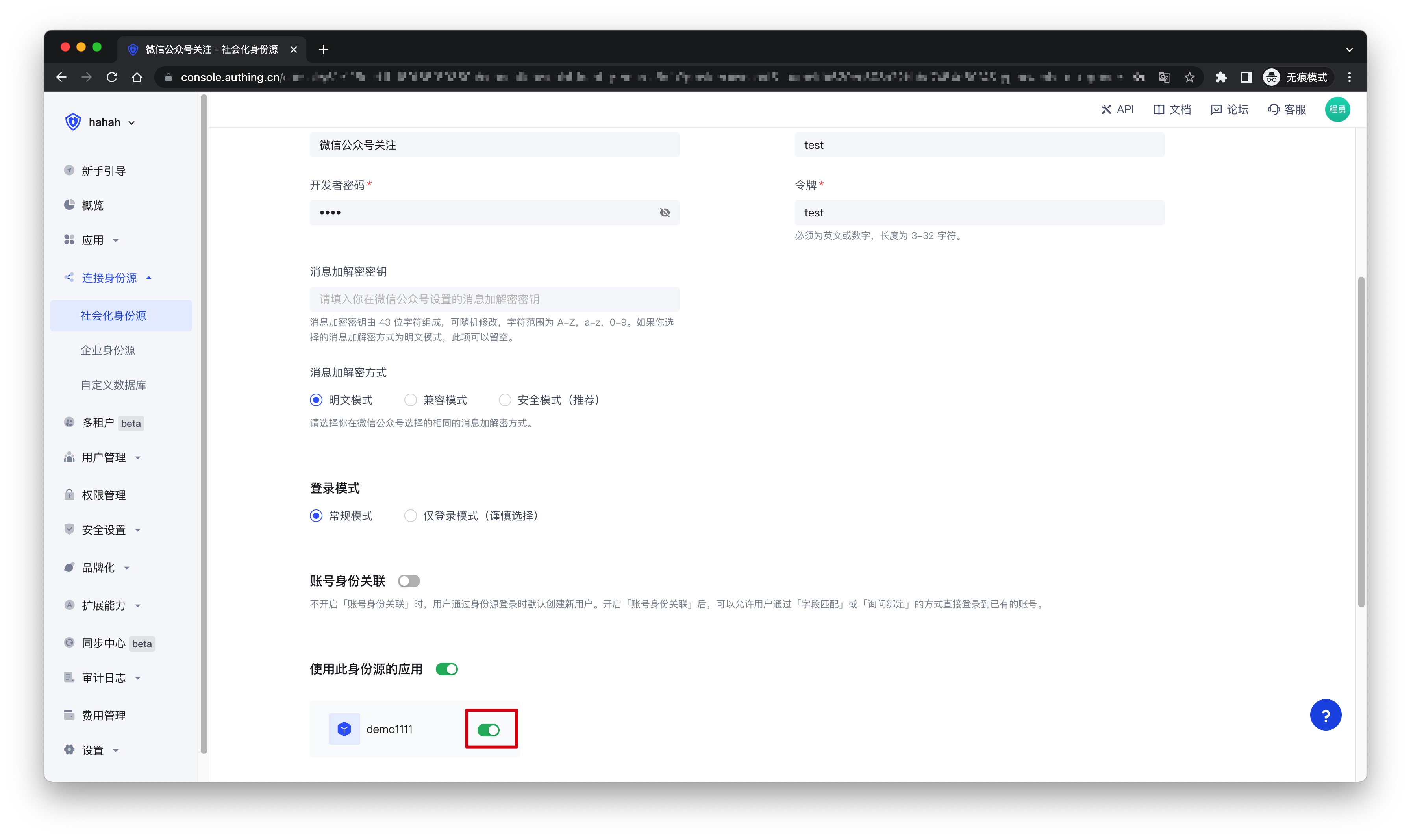 3.2 在已创建好的 微信公众号关注 身份源连接详情页面,开启并关联一个在 Authing 控制台创建的应用