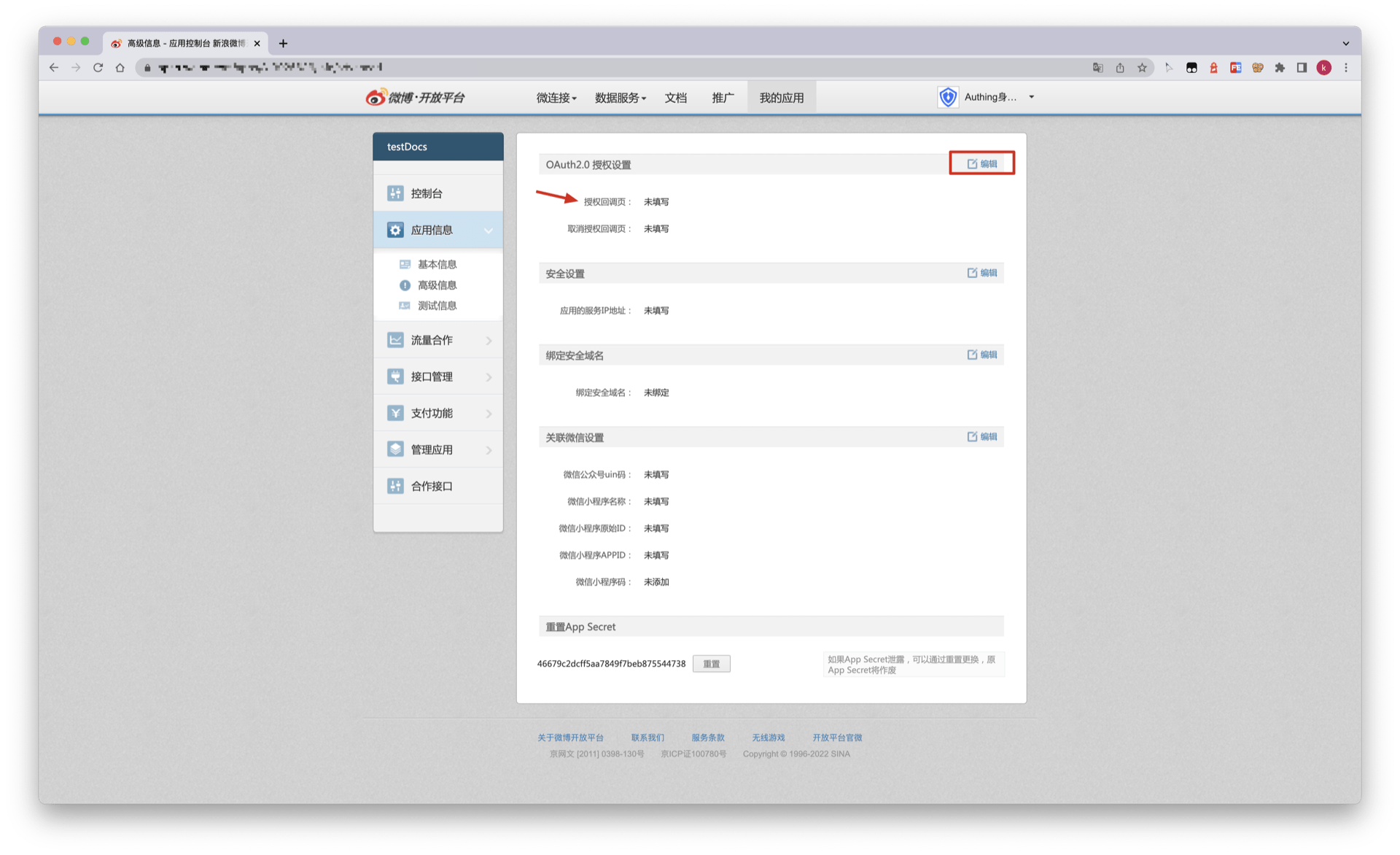 在 Authing 控制台上创建完新浪微博身份源后,需要将回调地址配置到微博开放平台上的平台信息里面的网站回调域。