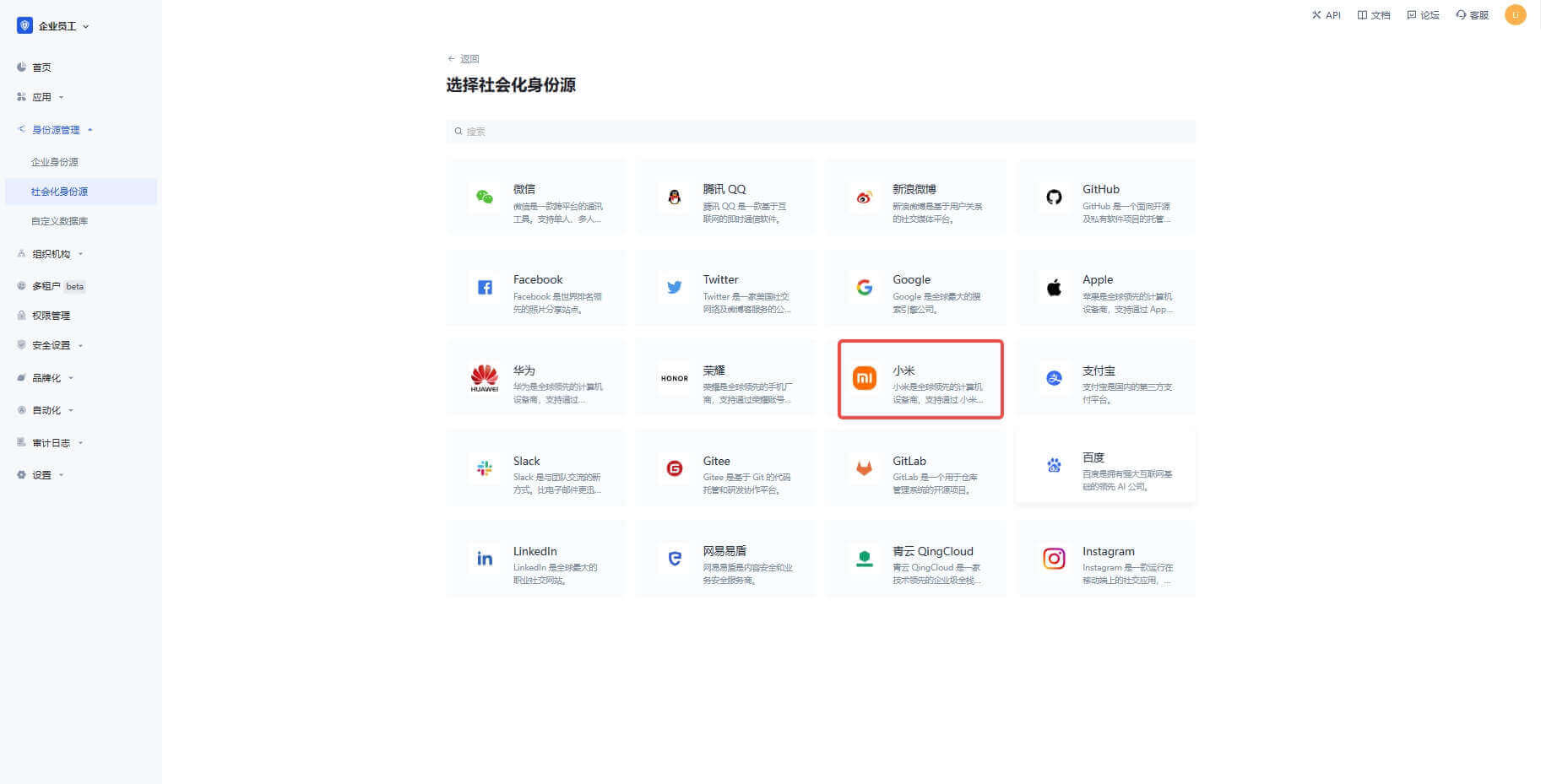2.2 请在 Authing 控制台 的「社会化身份源」-「选择社会化身份源」页面,点击「小米」身份源按钮,进入 「小米移动端登录模式」页面。