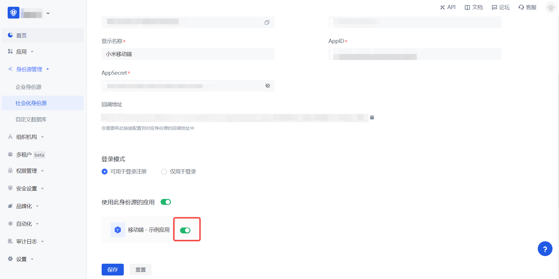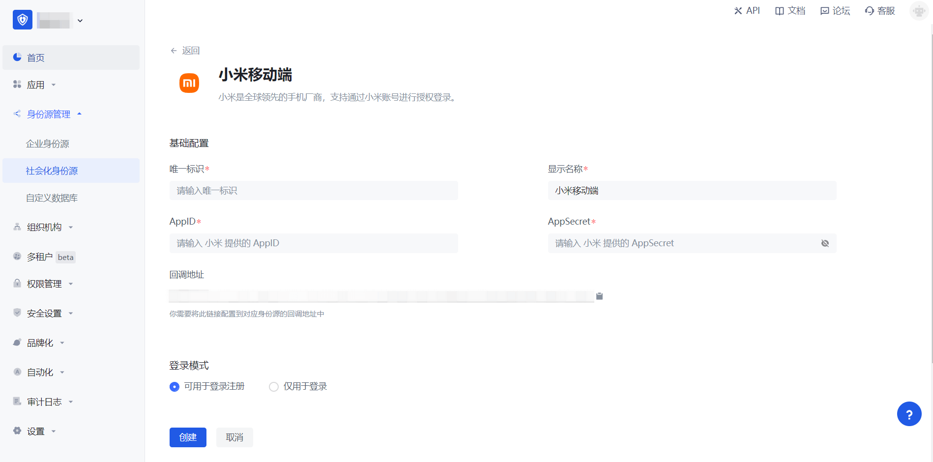 2.3 请在 Authing 控制台 的「社会化身份源」-「小米移动端」页面,配置相关的字段信息。