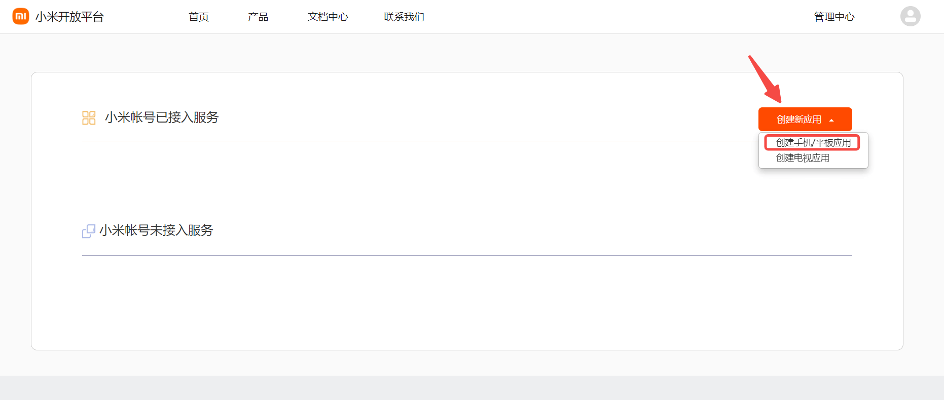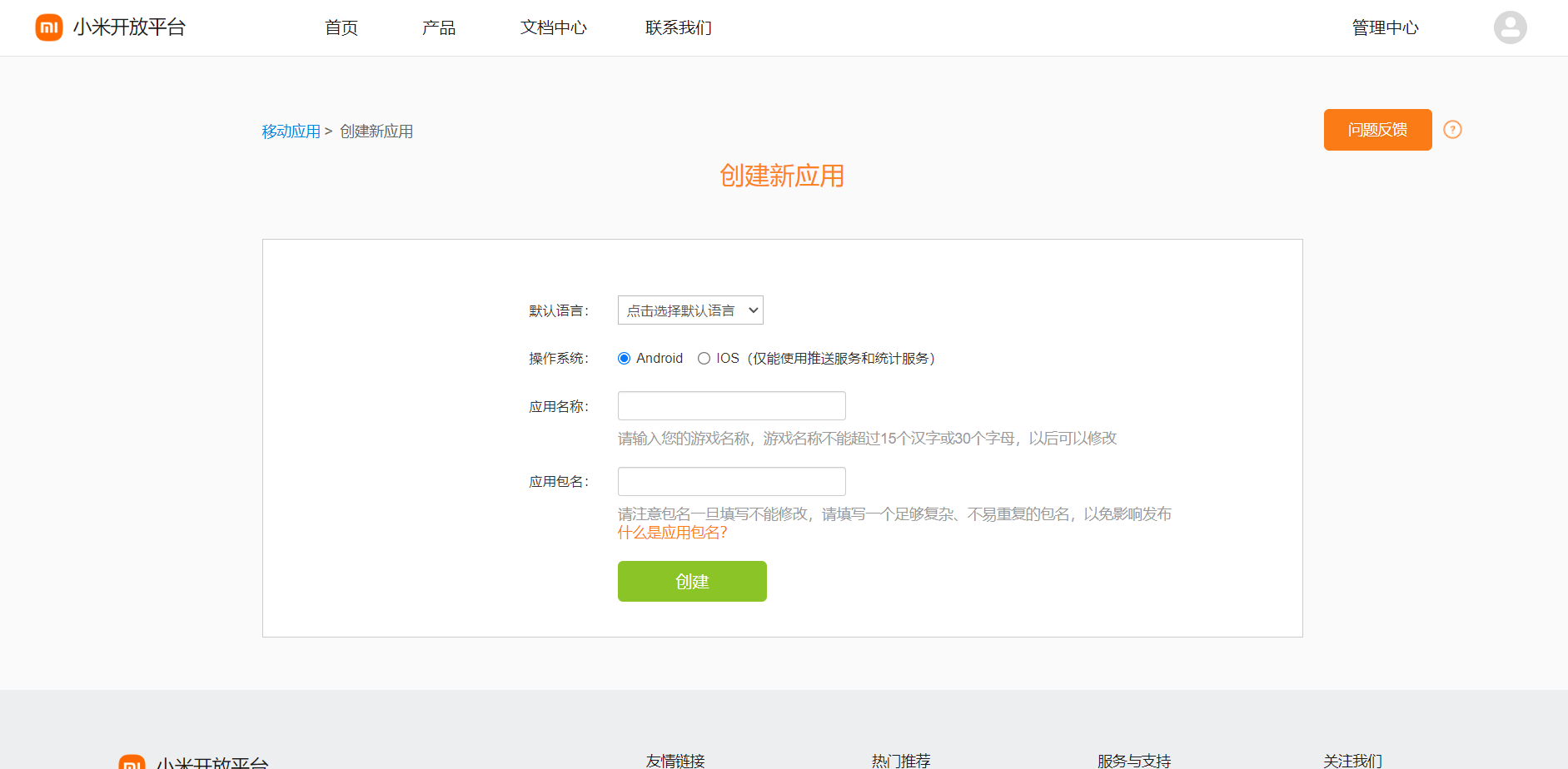 ¶ 第一步:在 小米 创建一个手机/平板应用