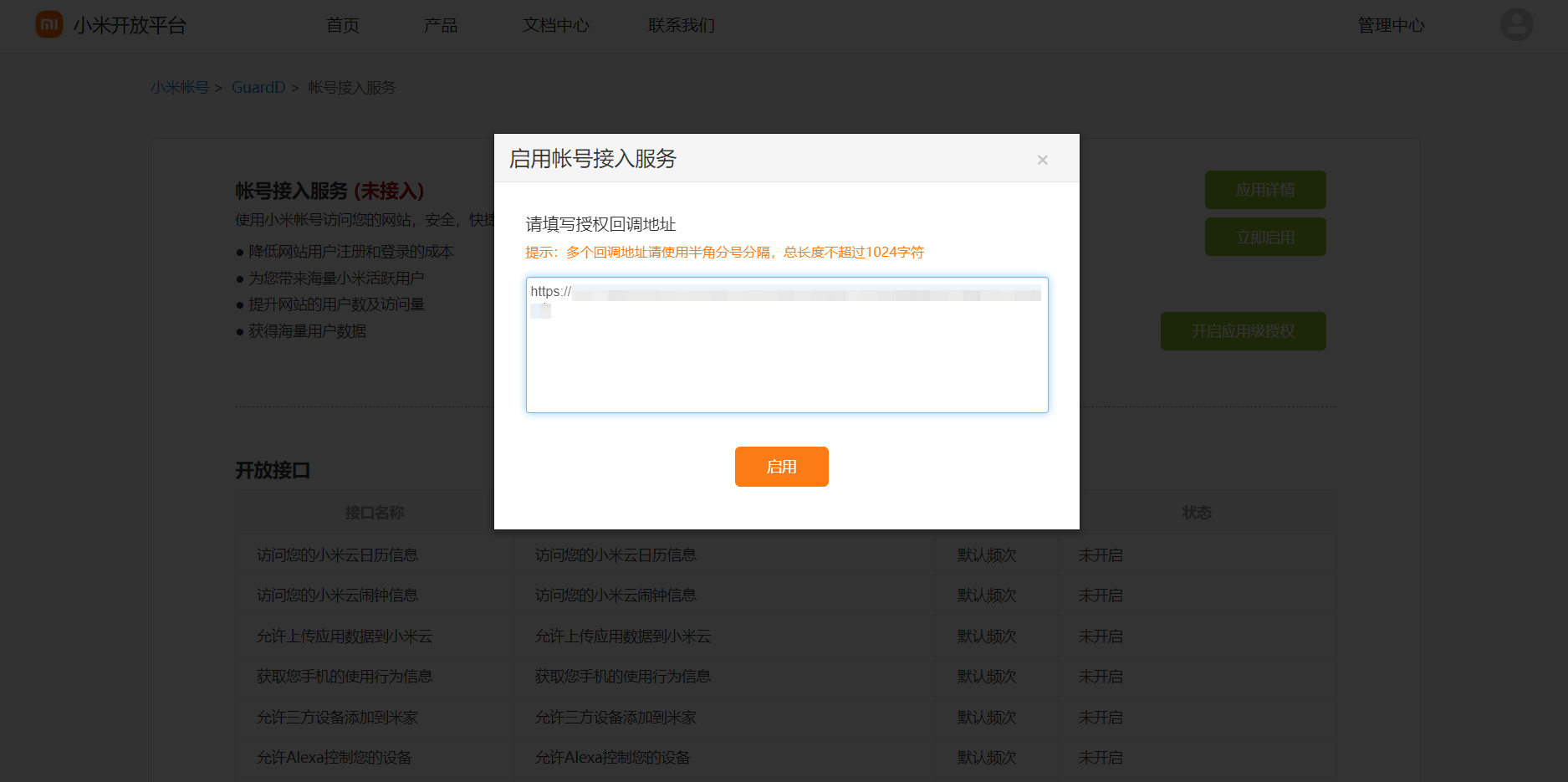| 回调地址 | 小米有效跳转 URI。需要将此 URL 配置到小米开放平台移动应用的授权回调页上。 |