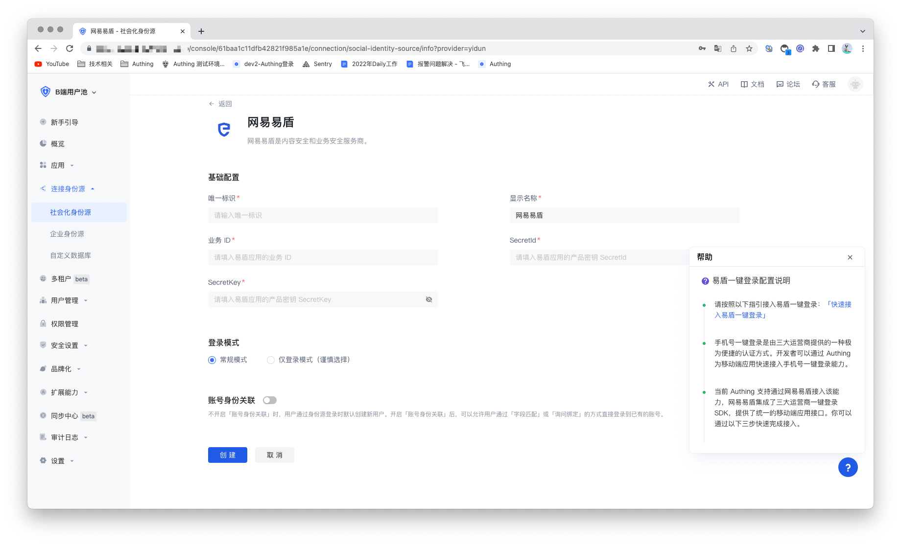 2.2 请在 Authing Console 控制台 的「社会化身份源」-「选择社会化身份源」页面,点击「易盾」身份源按钮,进入 「易盾登录模式」页面。