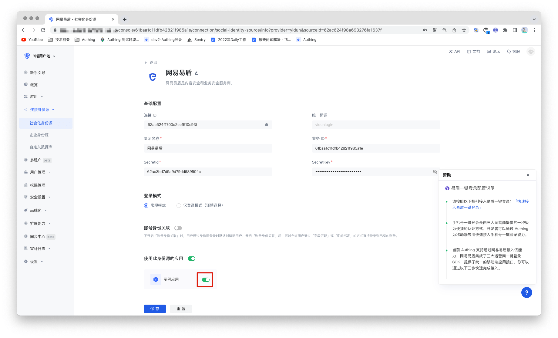 2.3 请在 Authing 控制台 的「社会化身份源」-「易盾」页面,配置相关的字段信息。