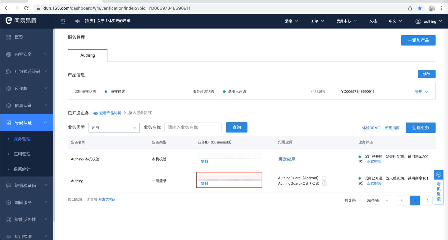 创建完应用,设置包名,上传签名等操作完成后,需要记录下业务 ID (business Id) 和号码认证服务接入凭证的产品密钥 SecretId、SecretKey。后续在 Authing 控制台配置易盾身份源时需要该数据。